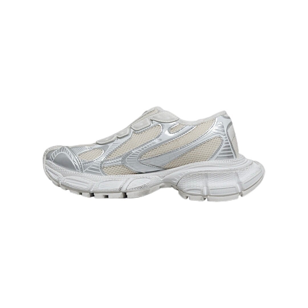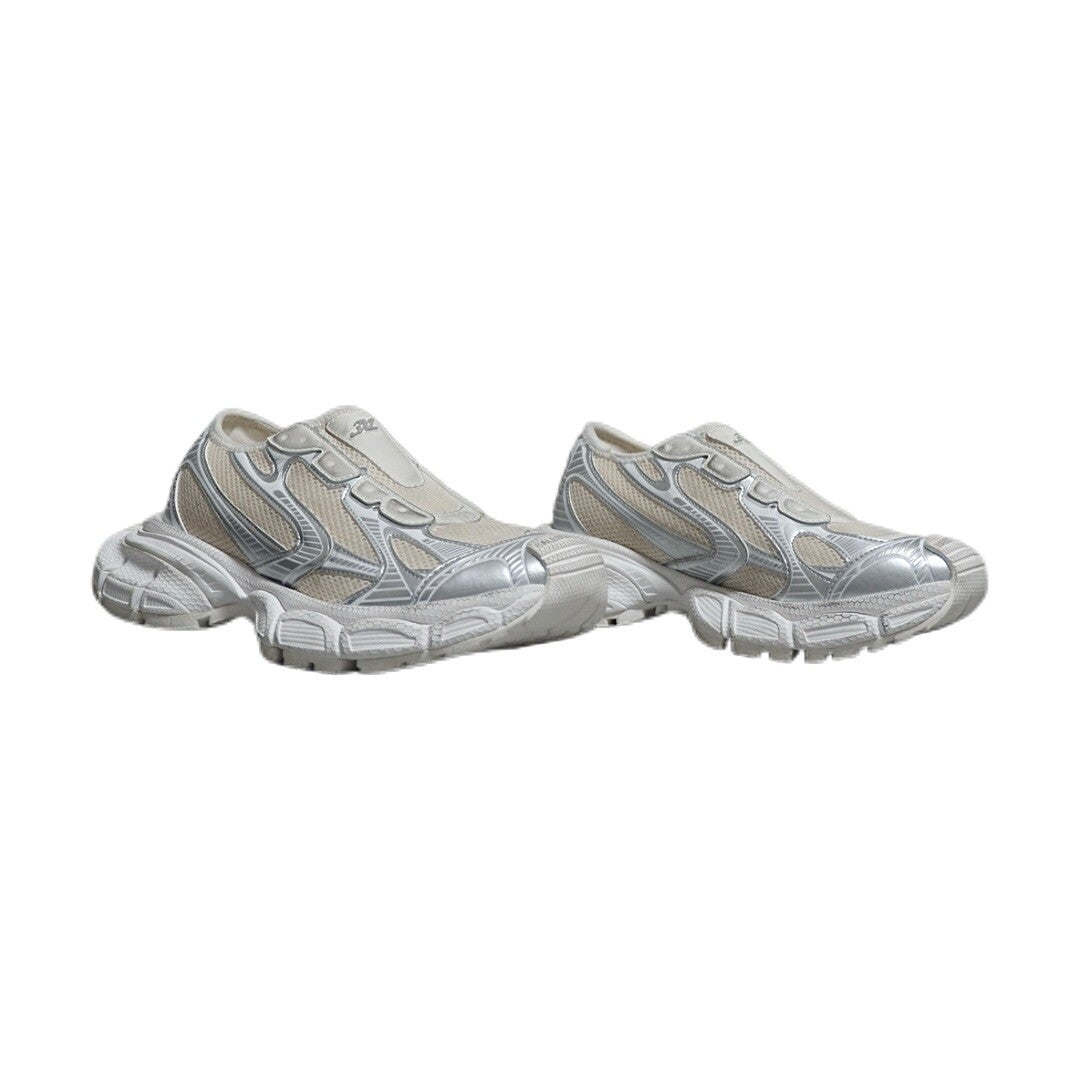 Oversized mesh silhouette with metallic silver accents and slip-on tabs for effortless deconstruction. Distressed polyurethane outsole and subtle Balenciaga branding evoke post-street edge—ideal for layering under cargos or slim tailoring.
