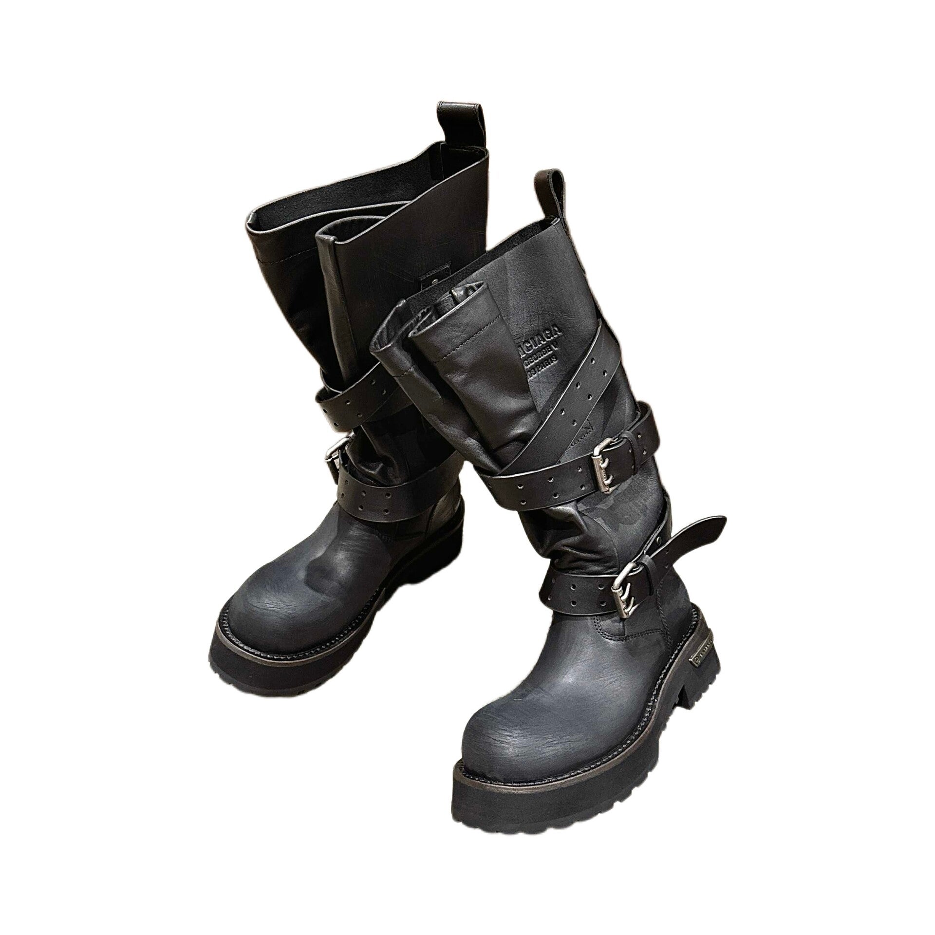 The BALENCIAGA Venom High Boot is a statement-making, knee-high footwear piece that embodies a powerful, grunge-infused aesthetic. Crafted from smooth, durable Black calfskin, the boot features a purposefully worn-out effect that gives it a distinctive, pre-loved look. It is defined by its strong silhouette, an extra-round toe, and multiple adjustable straps secured with belt buckles across the shaft, giving it a heavy-duty biker appeal. The boot is grounded by a thick, prominent toothed rubber outsole and is finished with subtle debossed Balenciaga branding details.