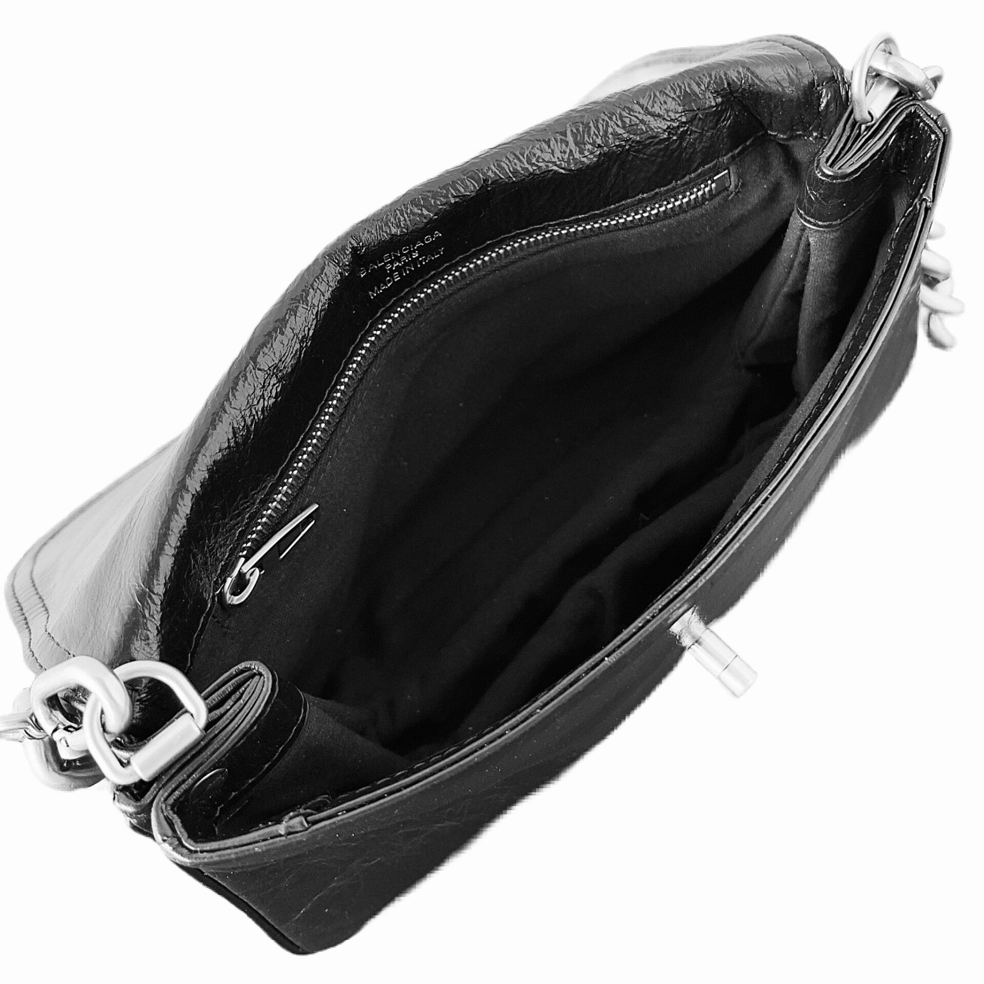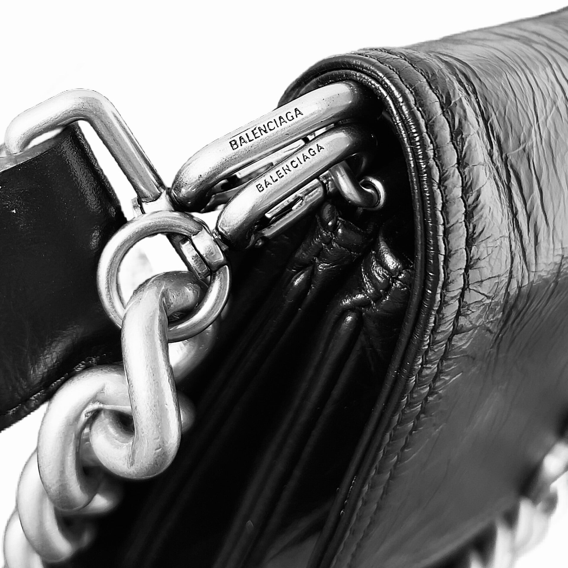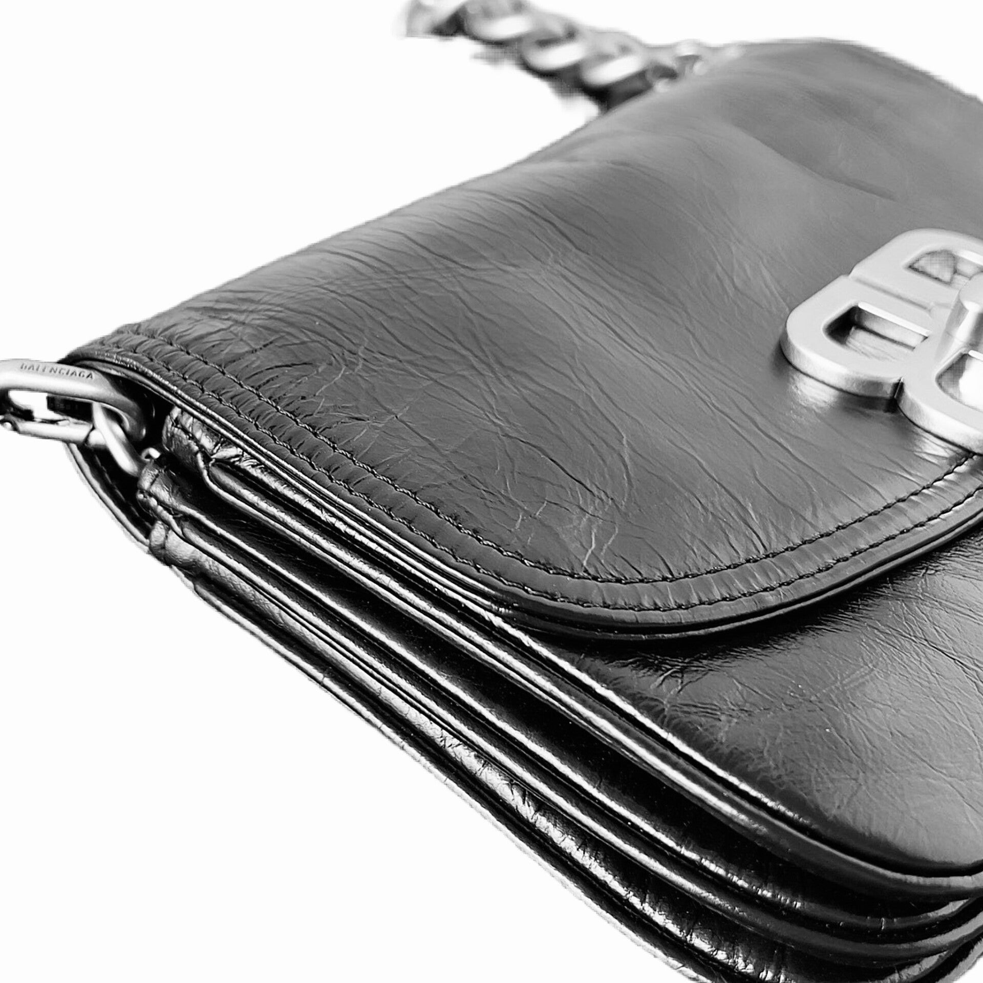 A sleek reimagining of Balenciaga’s signature chain bag, featuring the bold BB logo in aged-silver hardware as the focal point on supple black lambskin. Adjustable leather and chain strap allows for versatile shoulder or crossbody wear, with a secure magnetic closure and minimalist flap design—compact yet functional for urban essentials, blending rock-edged luxury with effortless day-to-night transition.