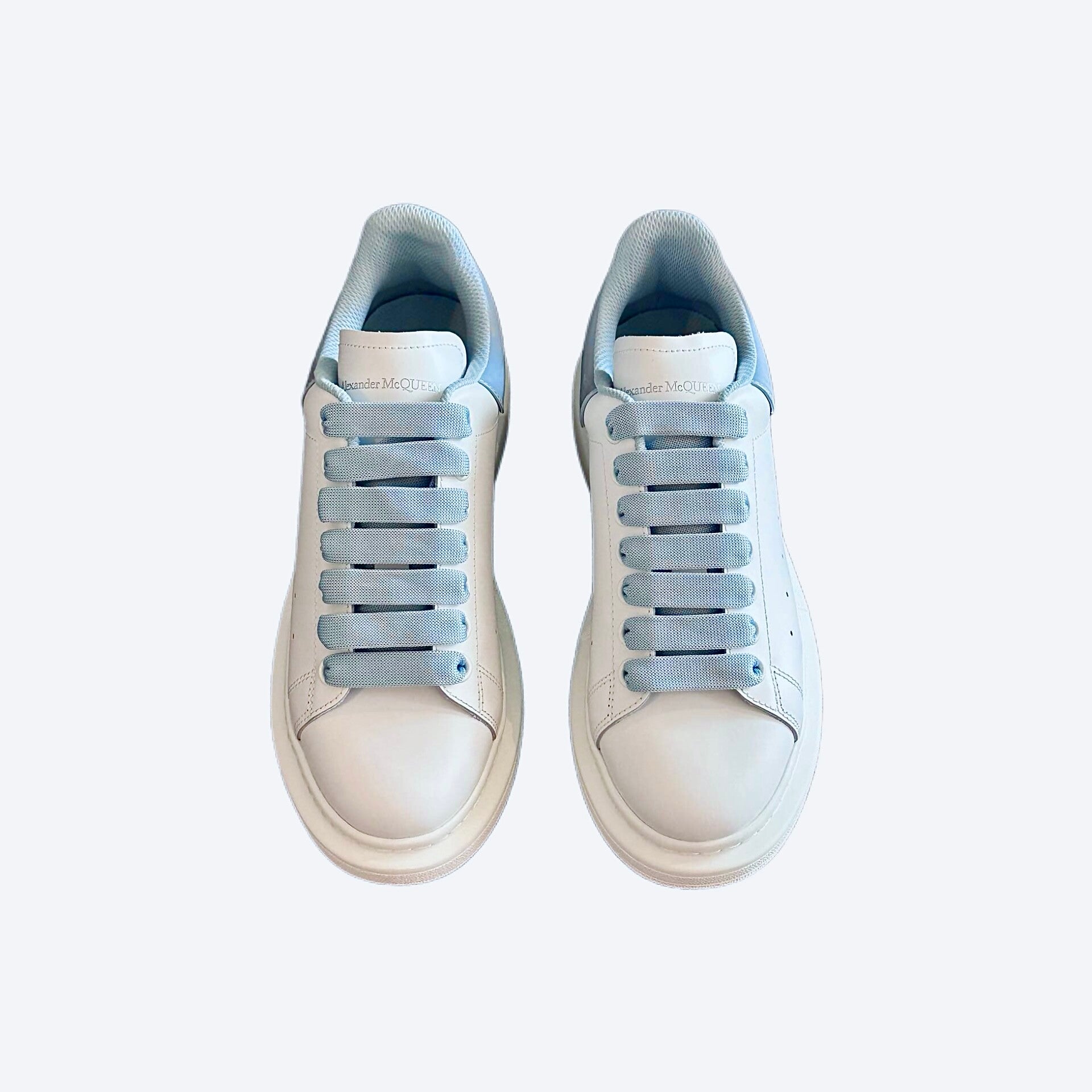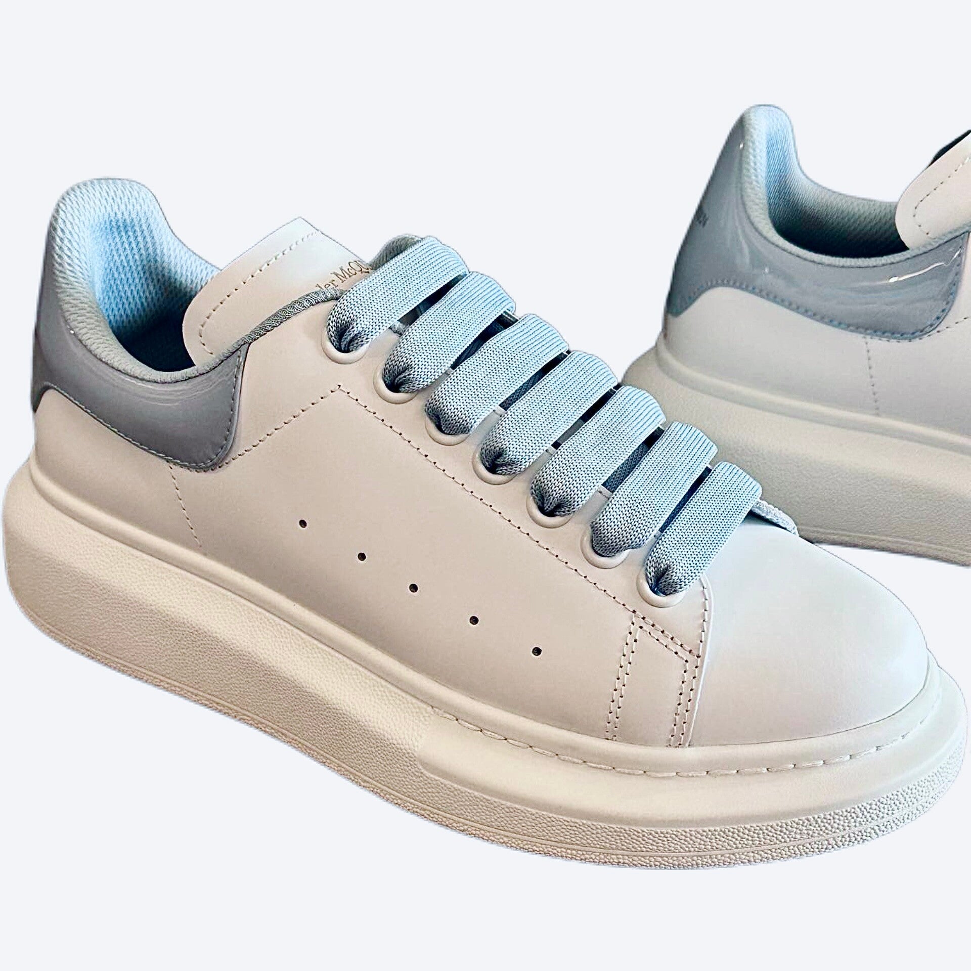 Signature oversized silhouette in pristine white smooth calf leather with large flat laces and McQueen branding on tongue and heel counter. Trimmed with a striking Paris Blue suede heel detail for subtle contrast, paired with an exaggerated rubber sole for elevated comfort and bold street presence—includes an extra set of white shoelaces for versatile styling.