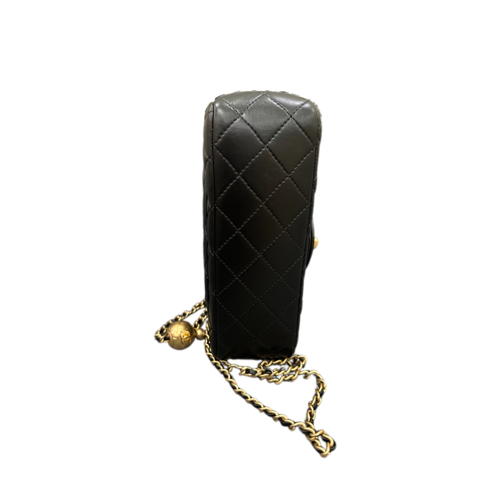 • Black caviar leather with diamond quilting • Gold-tone chain strap and double CC turnlock closure • Beaded CC charm accent • Leather lining