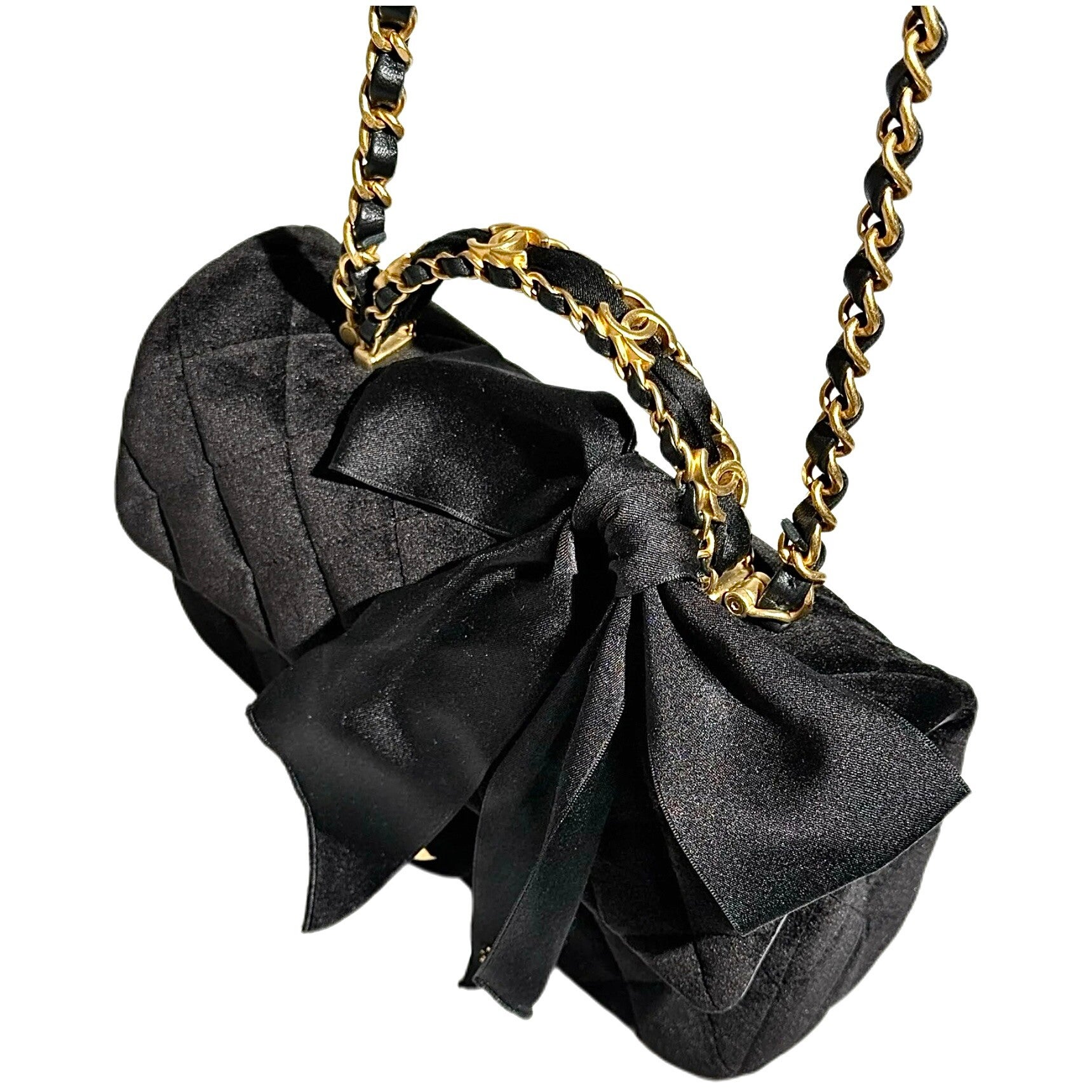 This CHANEL Mini Flap Bag is a limited-edition piece that celebrates the ribbon, an essential element woven into the vocabulary of the House. The bag is crafted from luxurious Black quilted velvet, giving it a rich, tactile finish. It features the classic rectangular flap silhouette and is appointed with the signature gold-tone CC turn-lock and the iconic metal chain interlaced with leather. The design is finished with a stunning, oversized silk bow detail at the top handle, lending a sophisticated and romantic touch to this highly coveted mini bag.