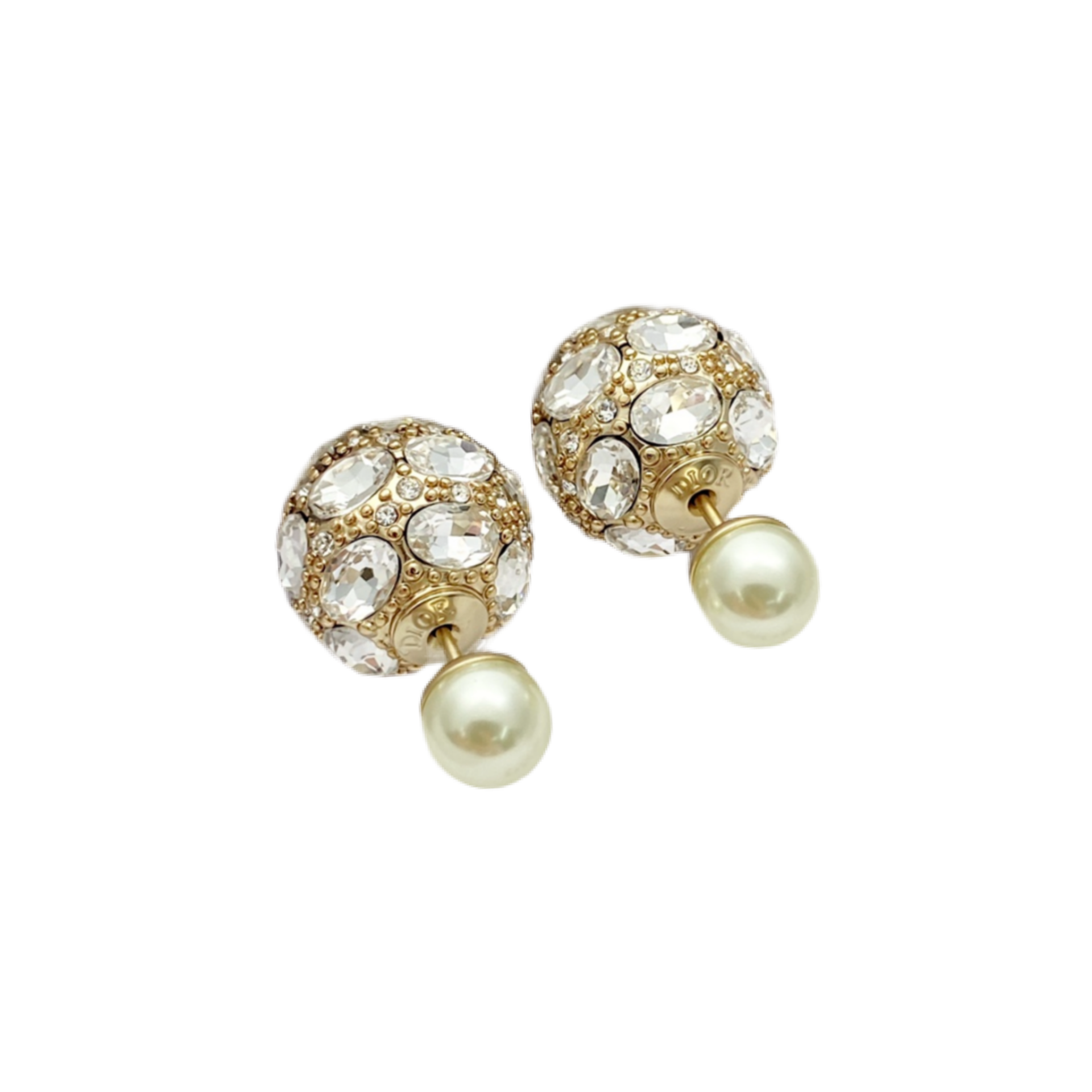 These DIOR Tribales Earrings offer a dazzling, embellished take on the House's iconic double-sided design. They are composed of two spheres: the front sphere, which sits on the lobe, is crafted from gold-finish metal and entirely covered in a pavé setting of brilliant clear/white crystals. The back sphere, which sits visible beneath the earlobe, is the signature White Resin Pearl. This version maximizes glamour with its sparkling crystal embellishment, combining the classic elegance of the pearl with luxurious contemporary shine.