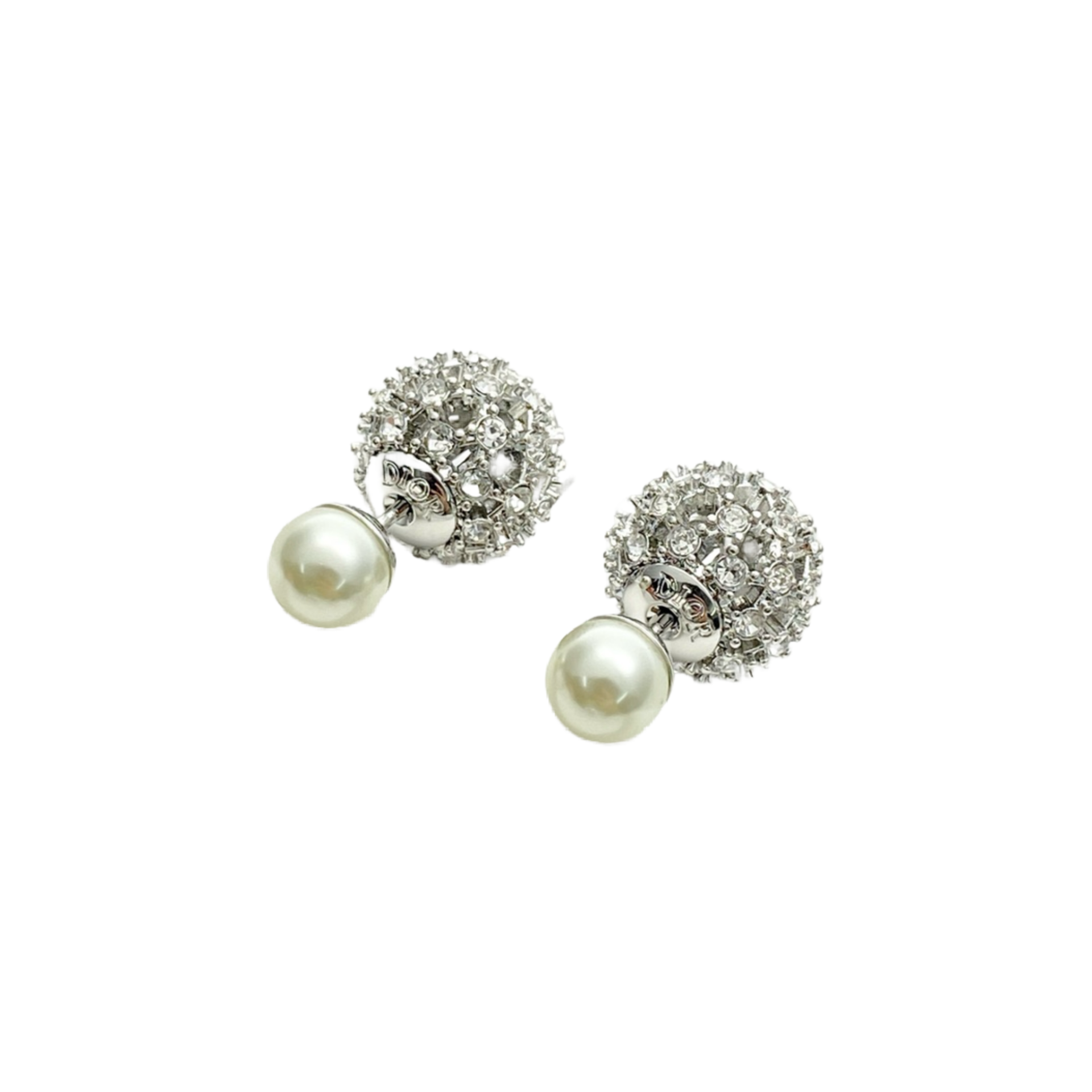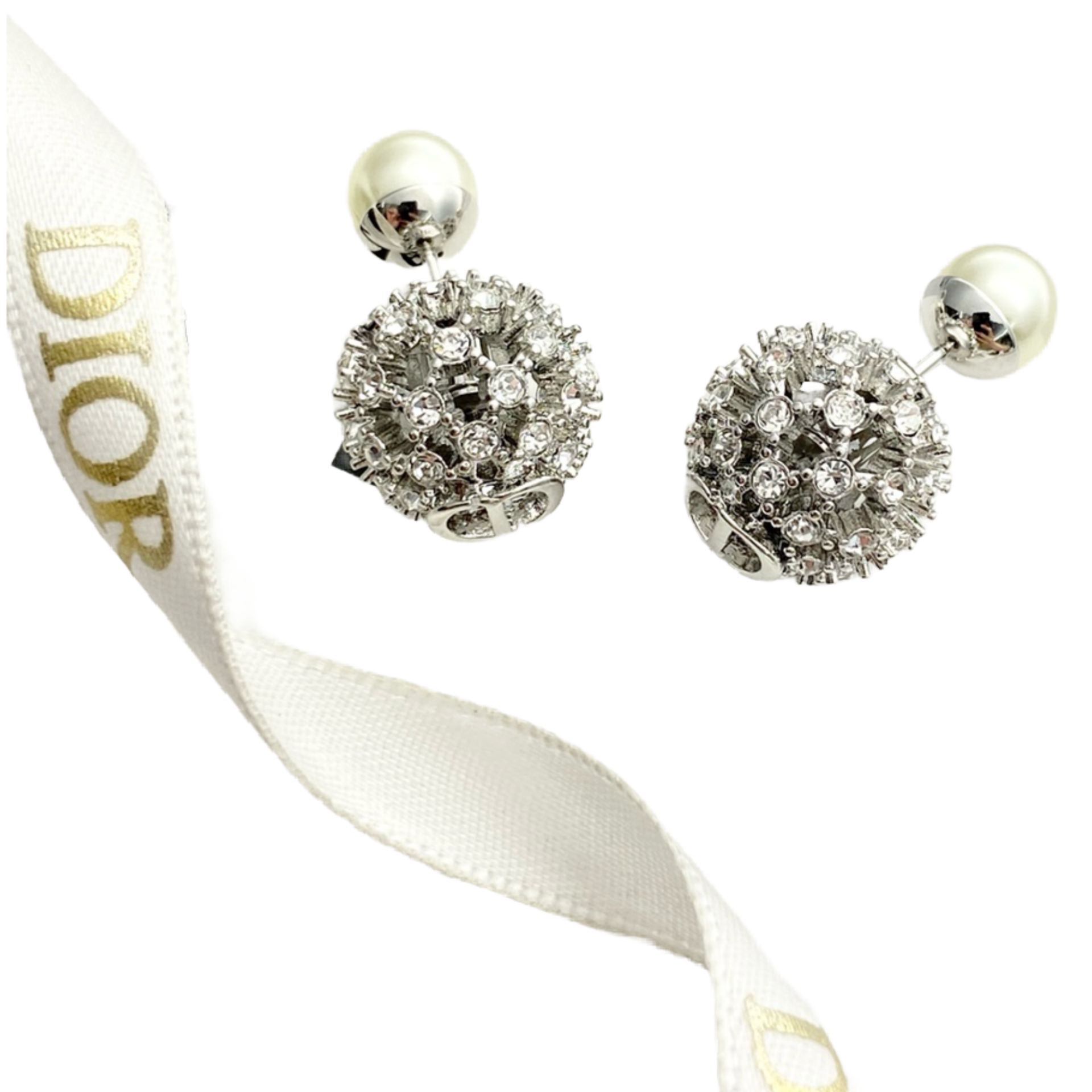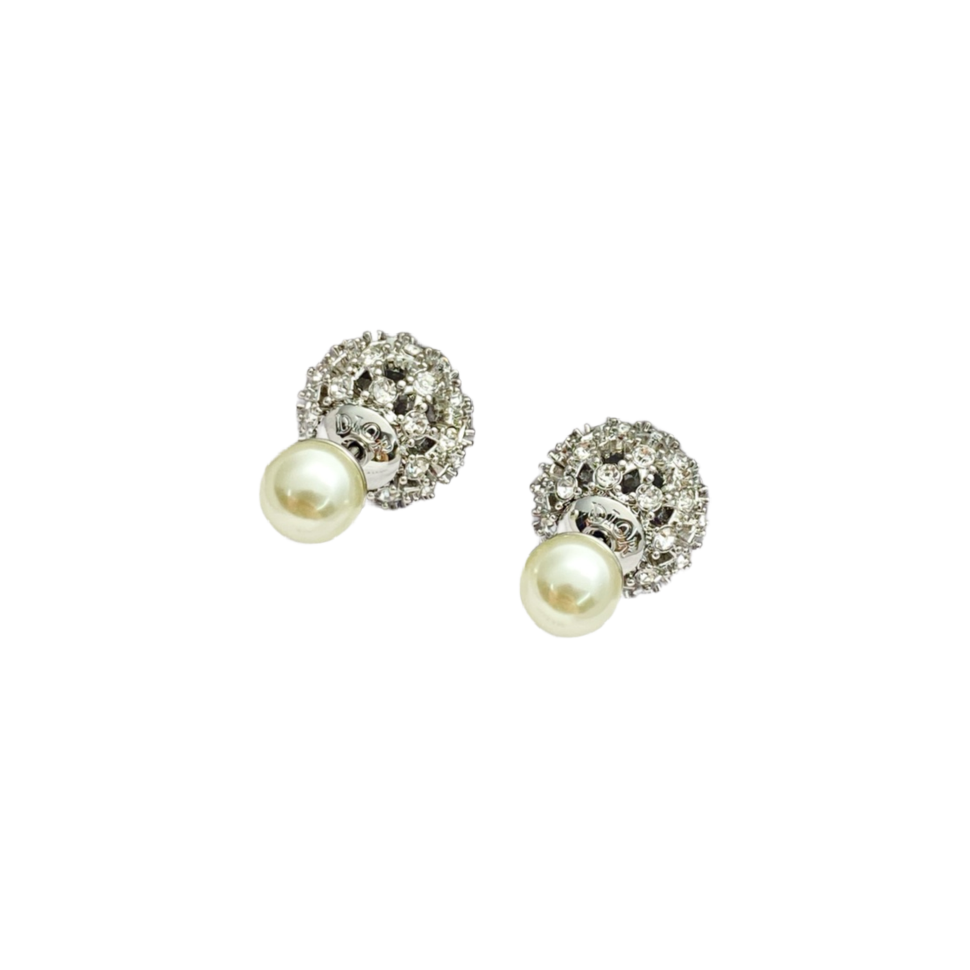 This pair of DIOR Tribales Earrings provides a spectacular, luminous iteration of the House's signature double-sided design. The iconic two-part structure is executed in a contemporary silver-finish metal. The prominent front sphere, which graces the earlobe, is completely covered in a luxurious pavé setting of brilliant clear/white crystals, offering maximum sparkle. The smaller sphere, which appears behind and below the lobe, is the classic White Resin Pearl, completing the recognizable silhouette. This statement style elegantly combines classic Dior design with modern, high-shine luxury.