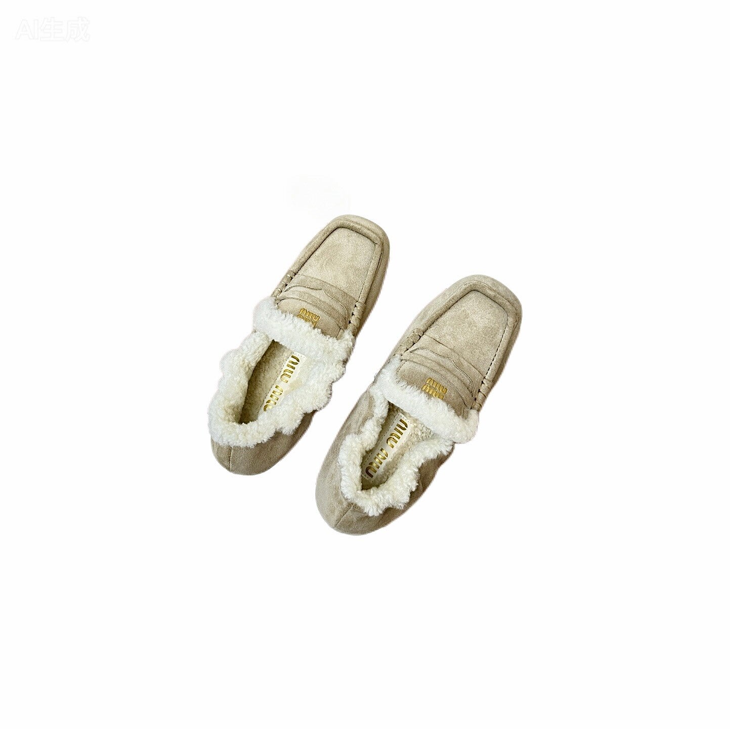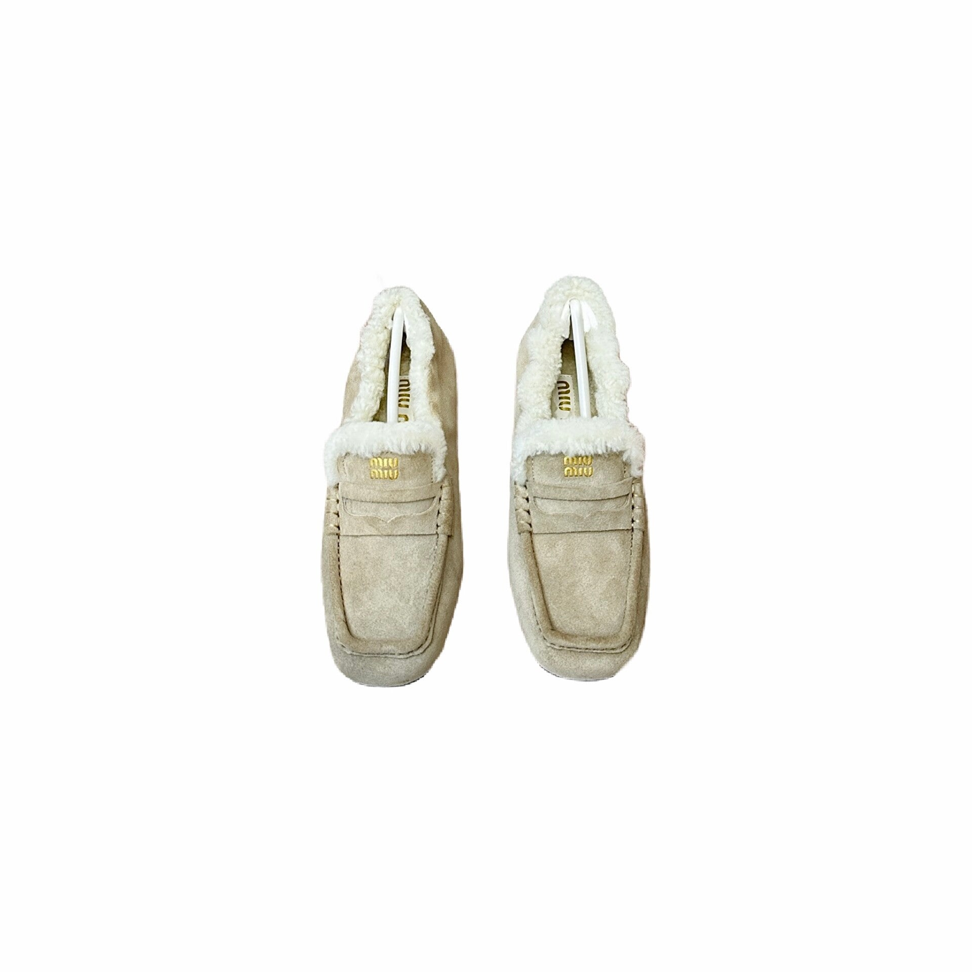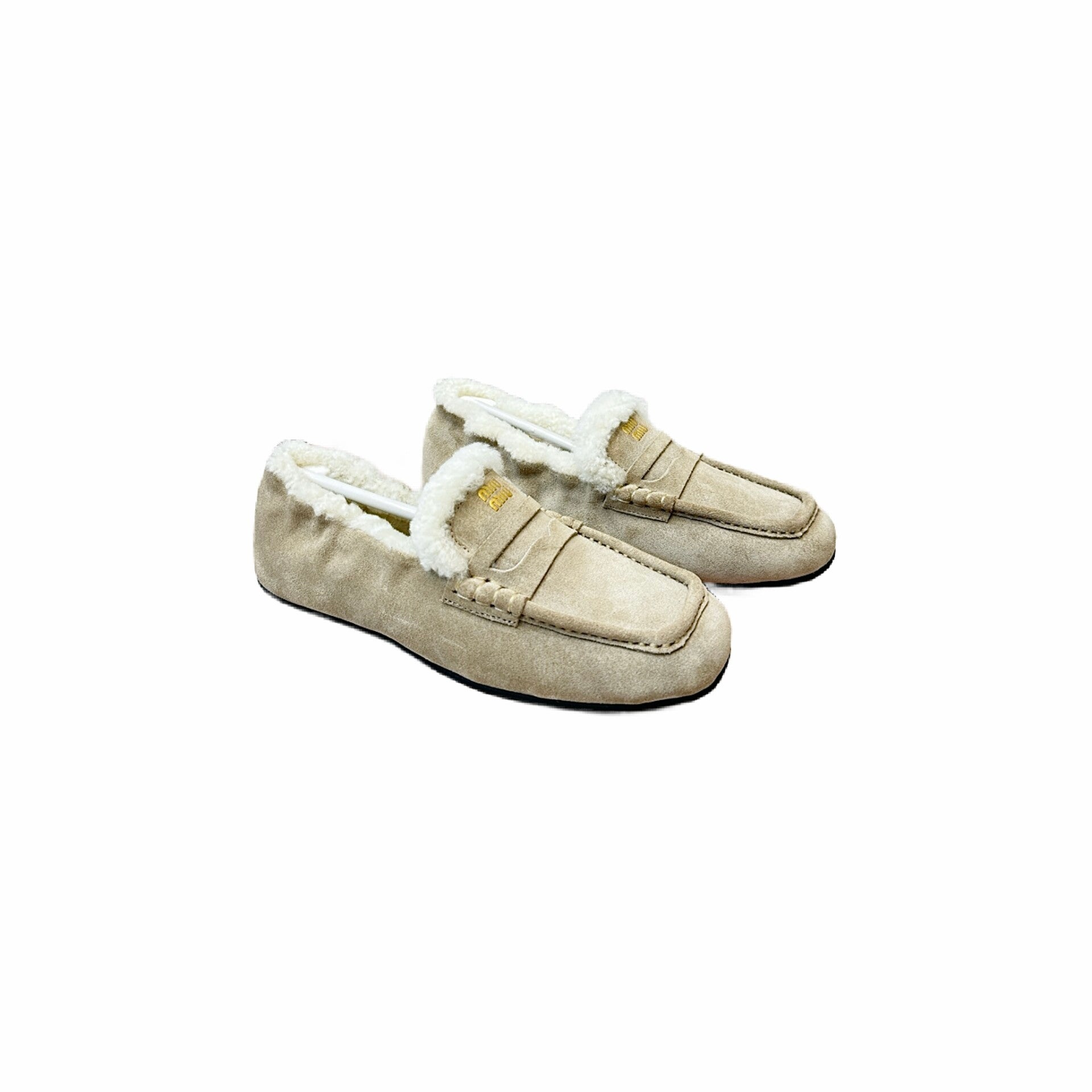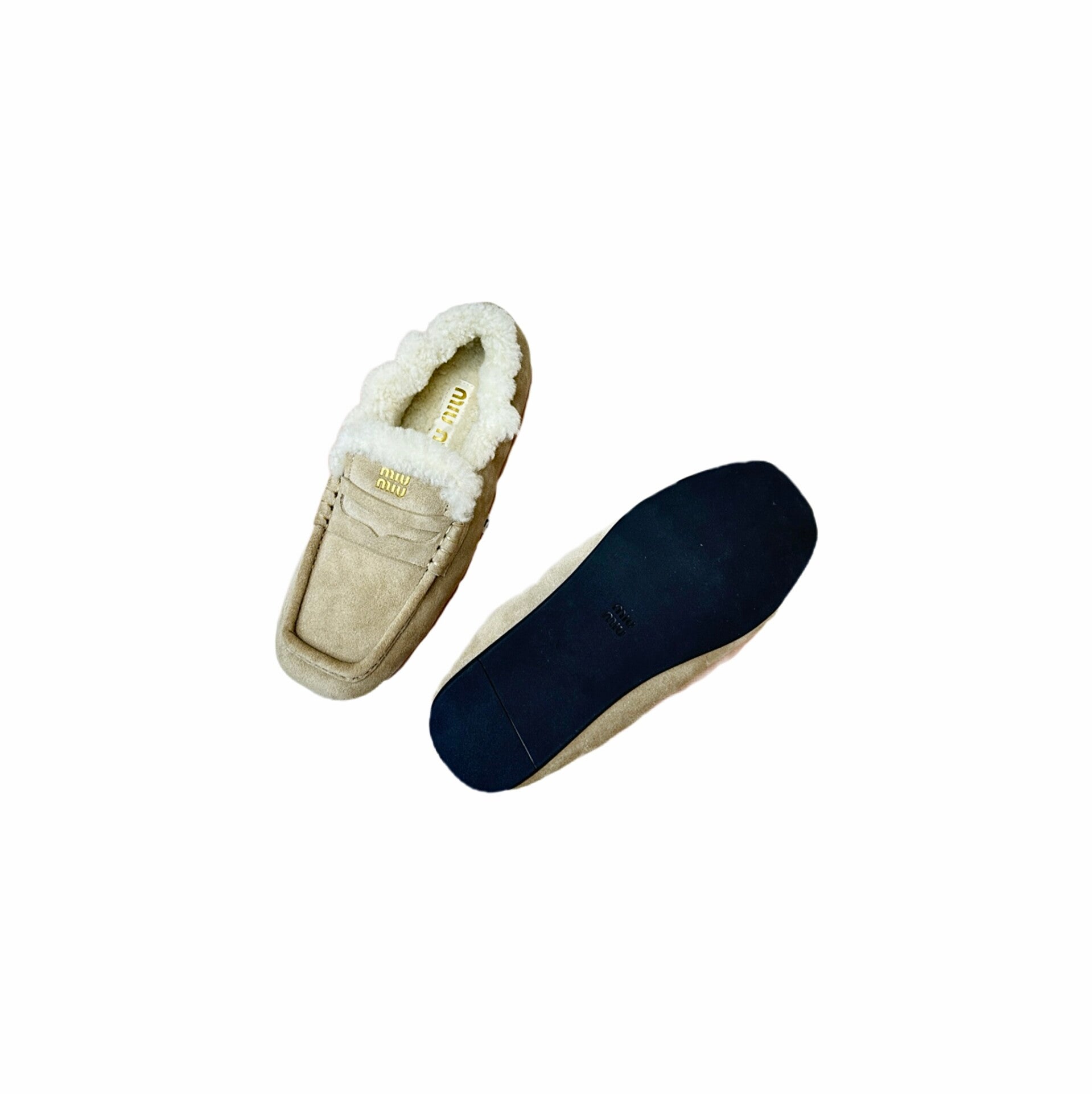 The loafer's light silhouette is reinterpreted with an unexpected seasonal character through the contrast of soft suede and plush shearling lining. This slip-on style features a classic round moc toe, accentuated by the fluffy shearling trim around the collar. The tonal design in a neutral beige hue is finished with the iconic embossed Miu Miu logo on the penny strap, making it a luxurious yet casual essential for colder seasons.