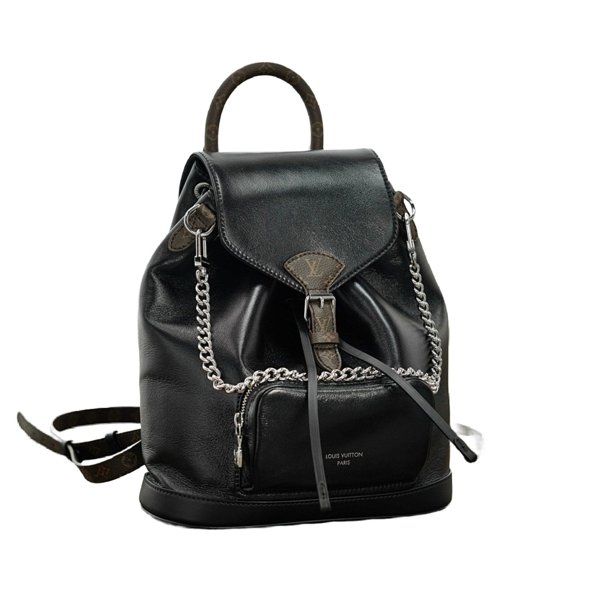 The LOUIS VUITTON Montsouris Vibe Small Backpack makes a striking fashion statement, fusing luxurious imported lambskin with the Maison’s timeless Monogram canvas. This unique 'Black Warrior' design is finished with sharp silver-toned chain accents, embodying a contemporary punk-inspired aesthetic that effortlessly draws attention.