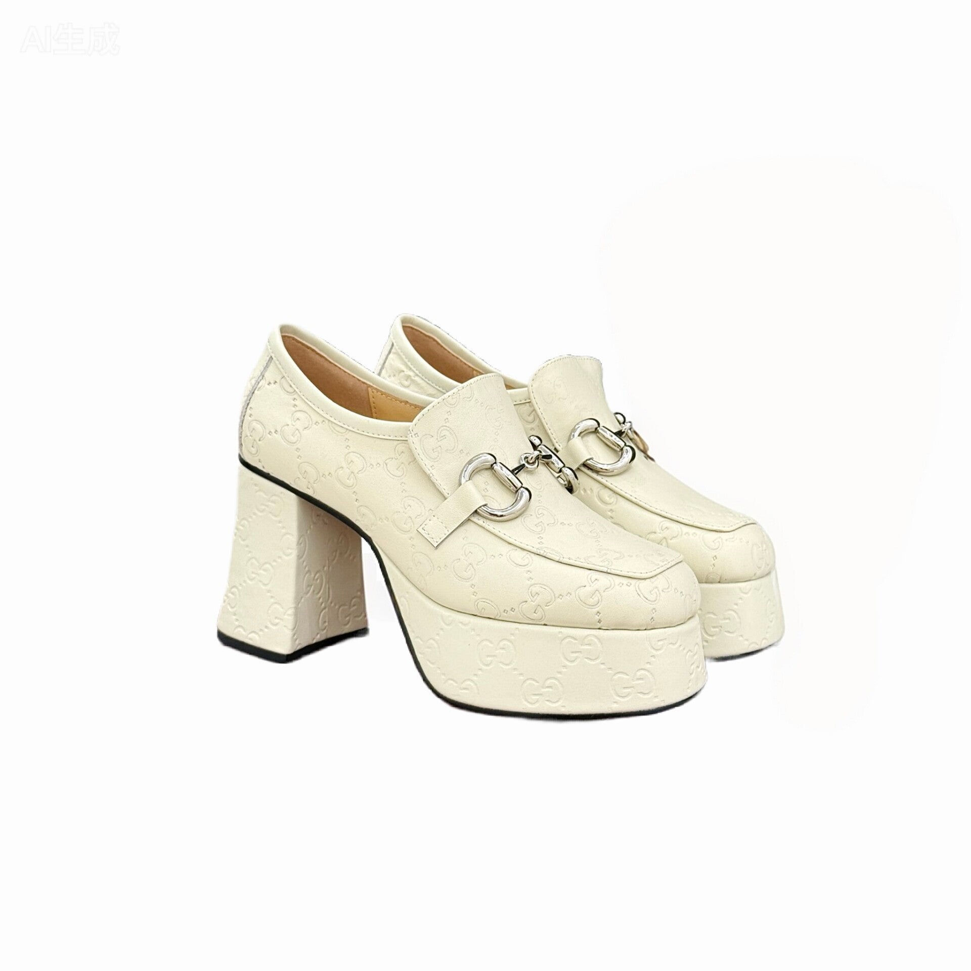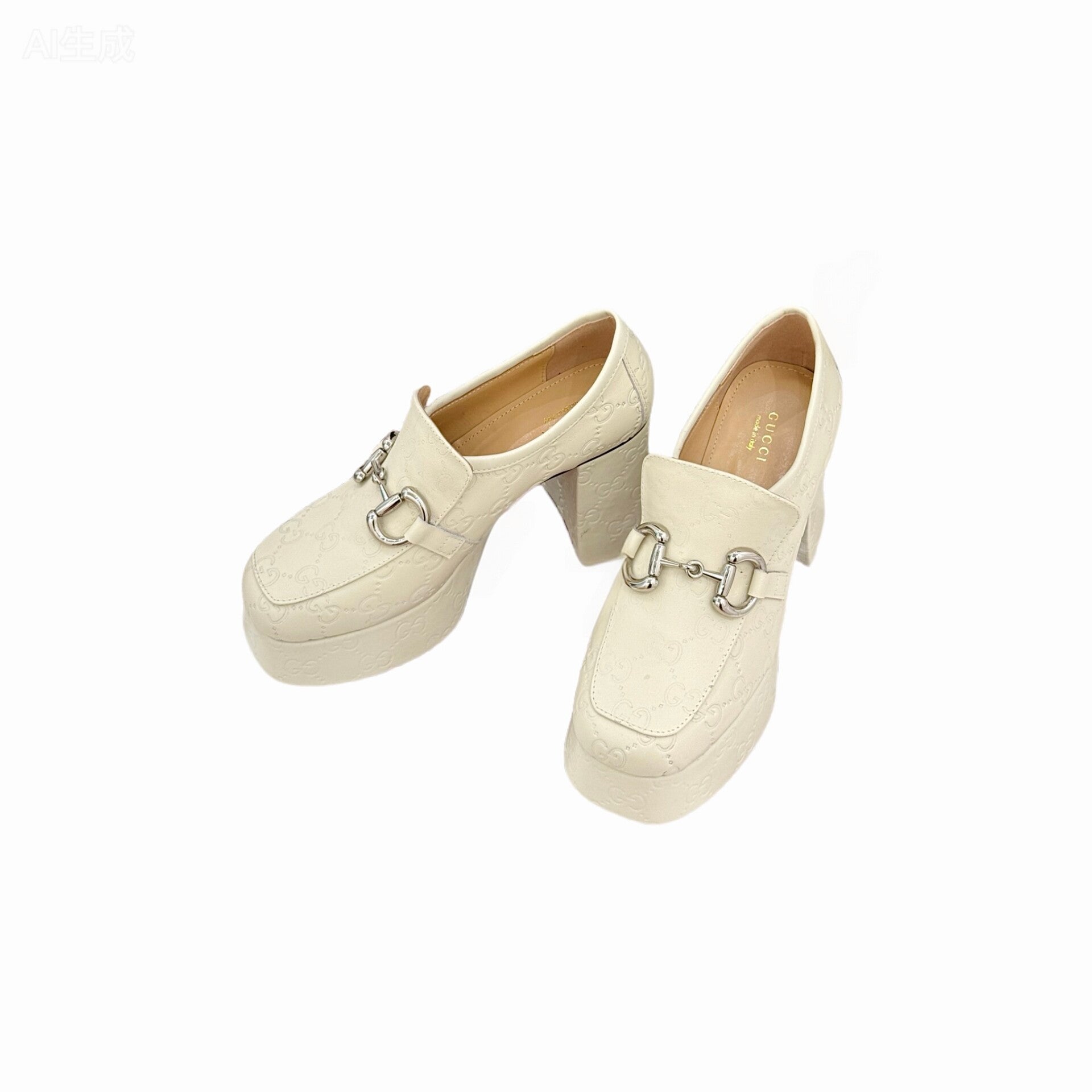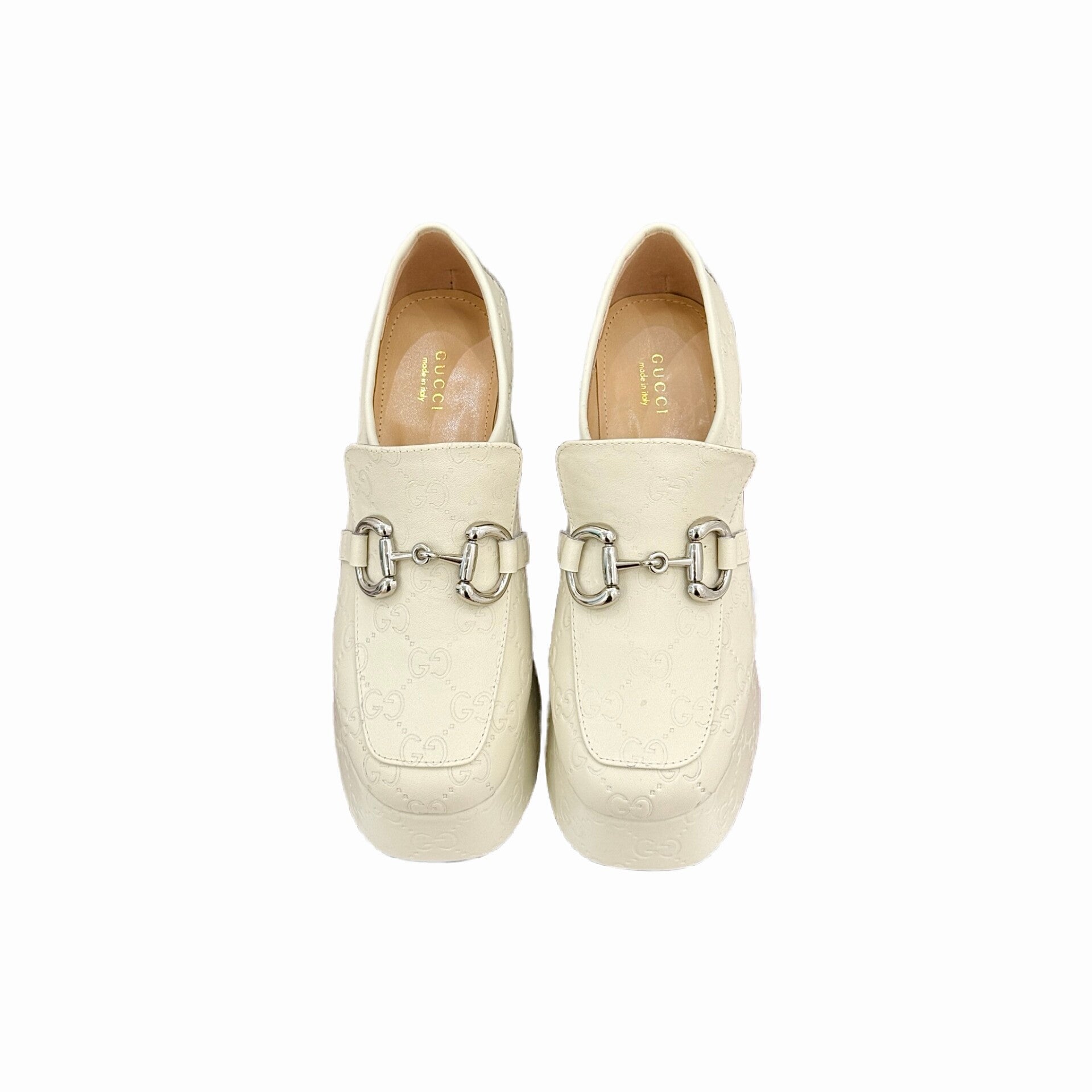 The GUCCI Horsebit Platform Loafer is a bold yet elegant footwear choice, celebrating the brand’s enduring legacy with a modern twist. The shoe's design is anchored by the iconic 1953 Horsebit design, updated here with a pale gold buckle. It innovatively fuses a substantial waterproof platform with a chunky block heel, elevating the traditional flat loafer design. Crafted using custom original leather with a sheepskin interior padding, this shoe ensures a high level of comfort and luxury. Its clever design provides subtle height and visually lengthens the leg line.