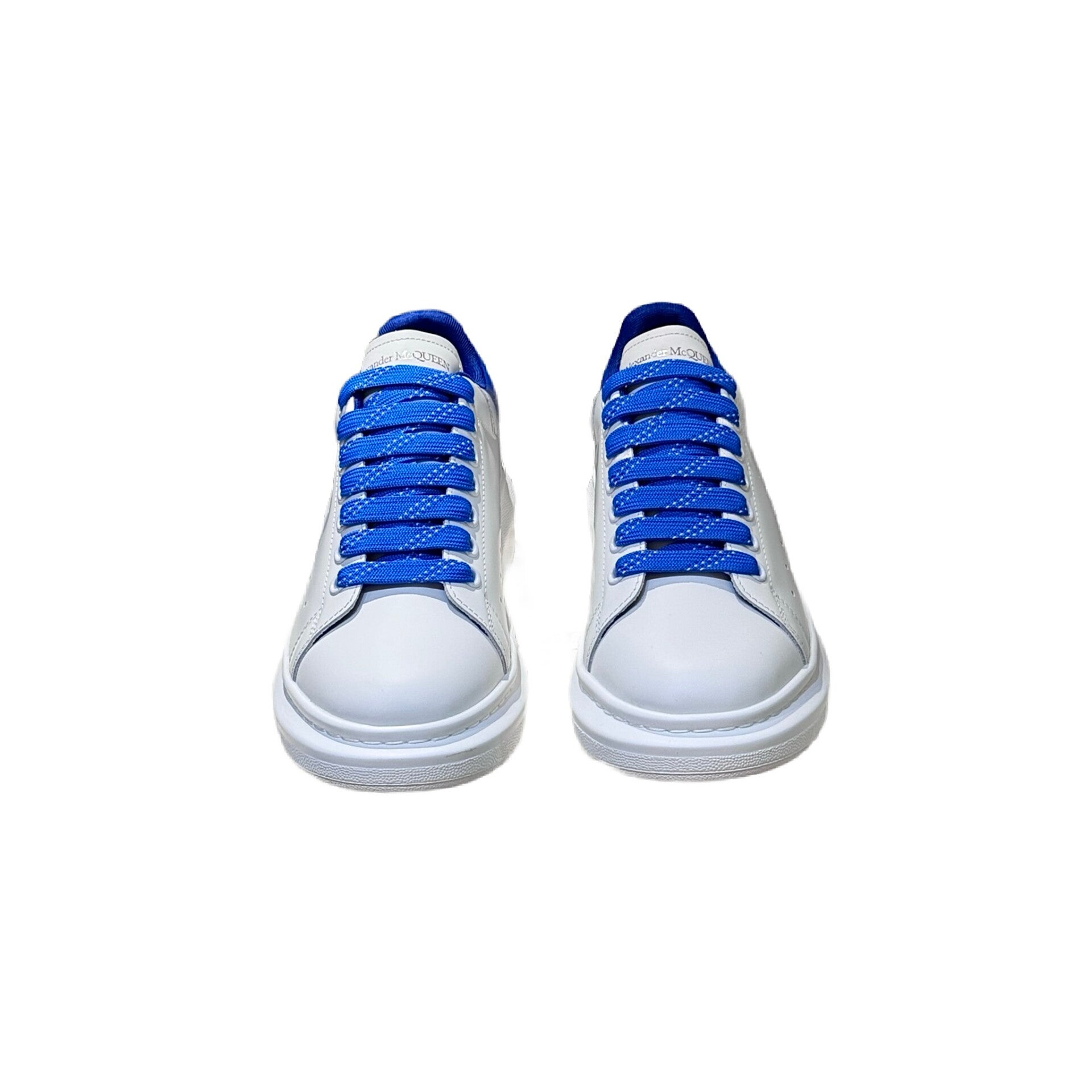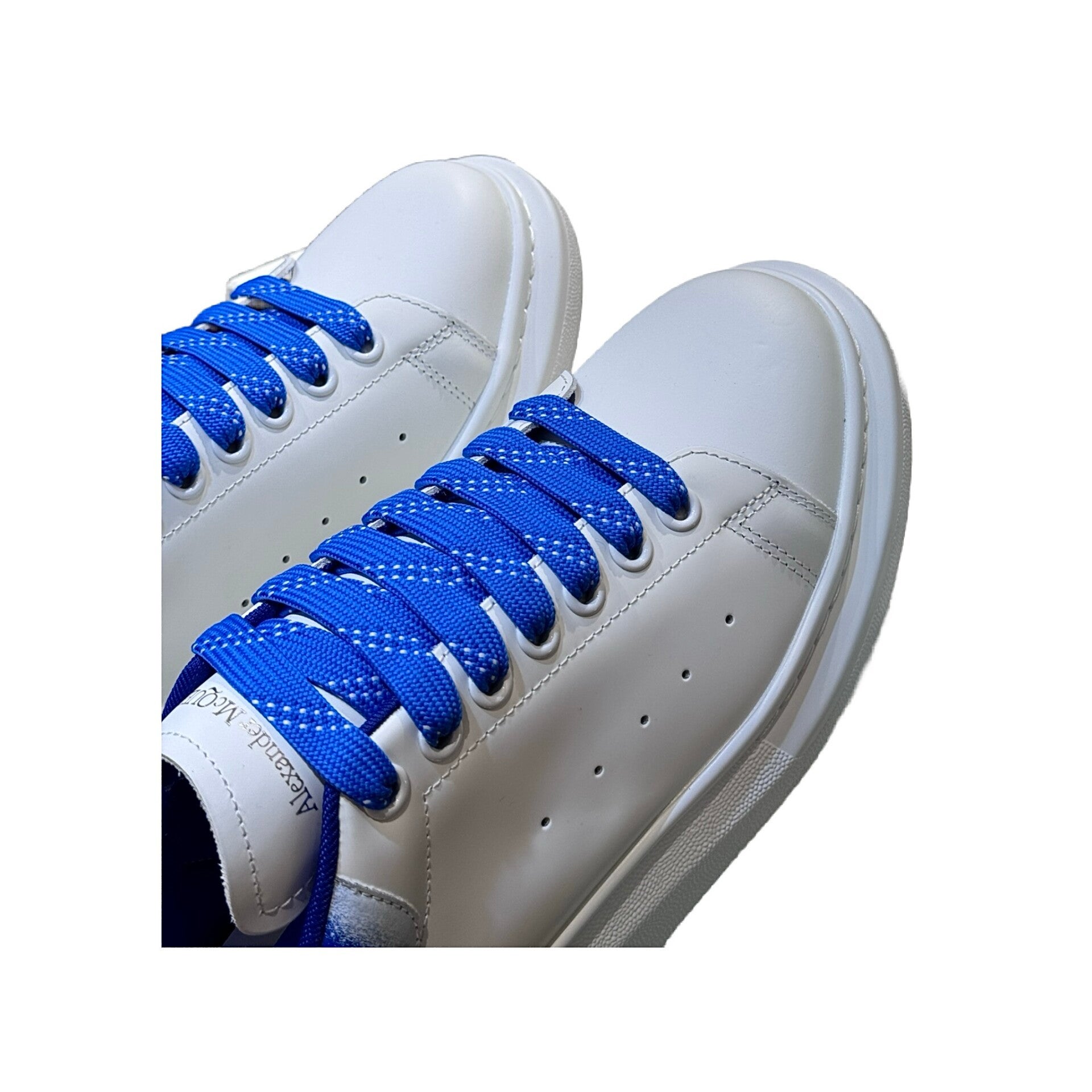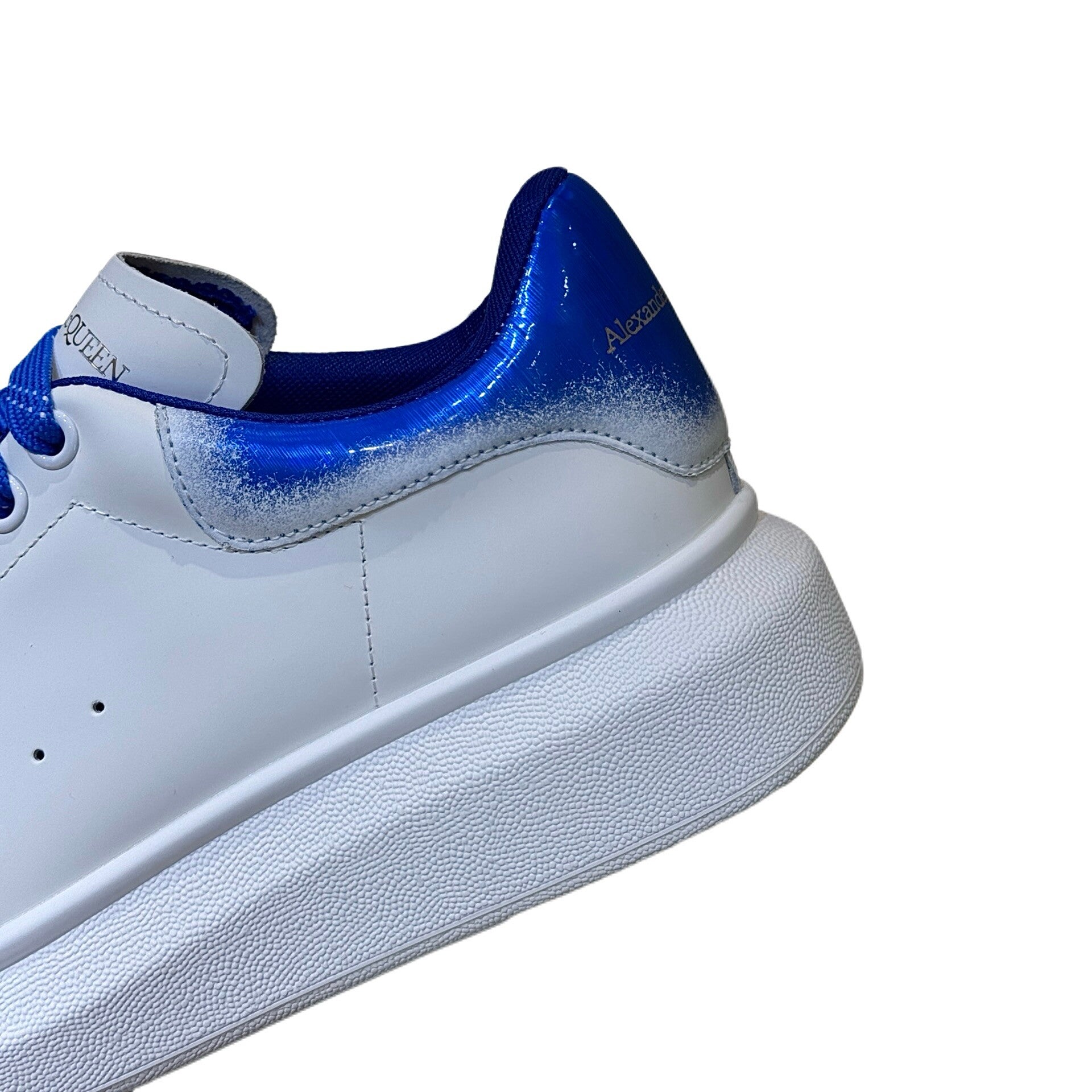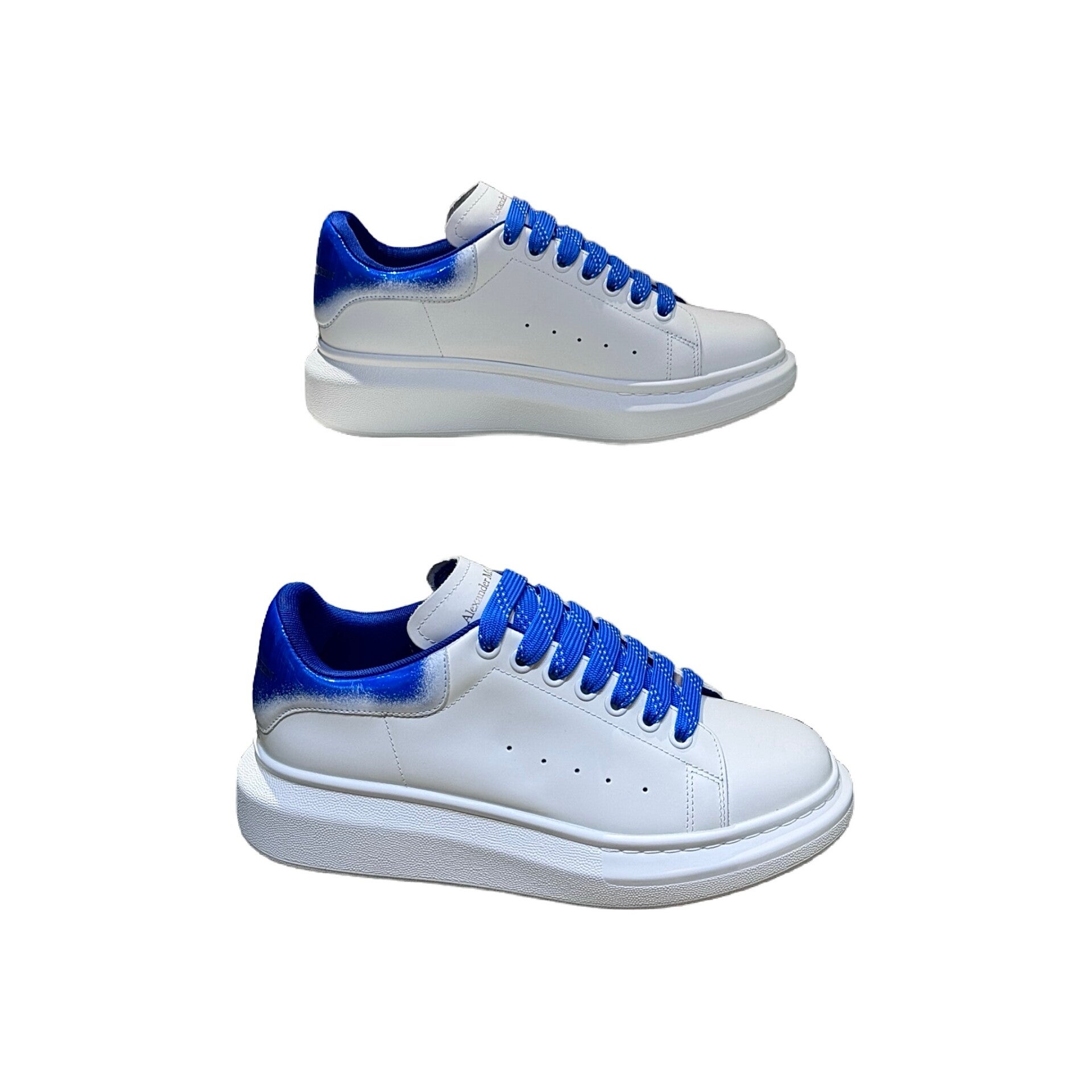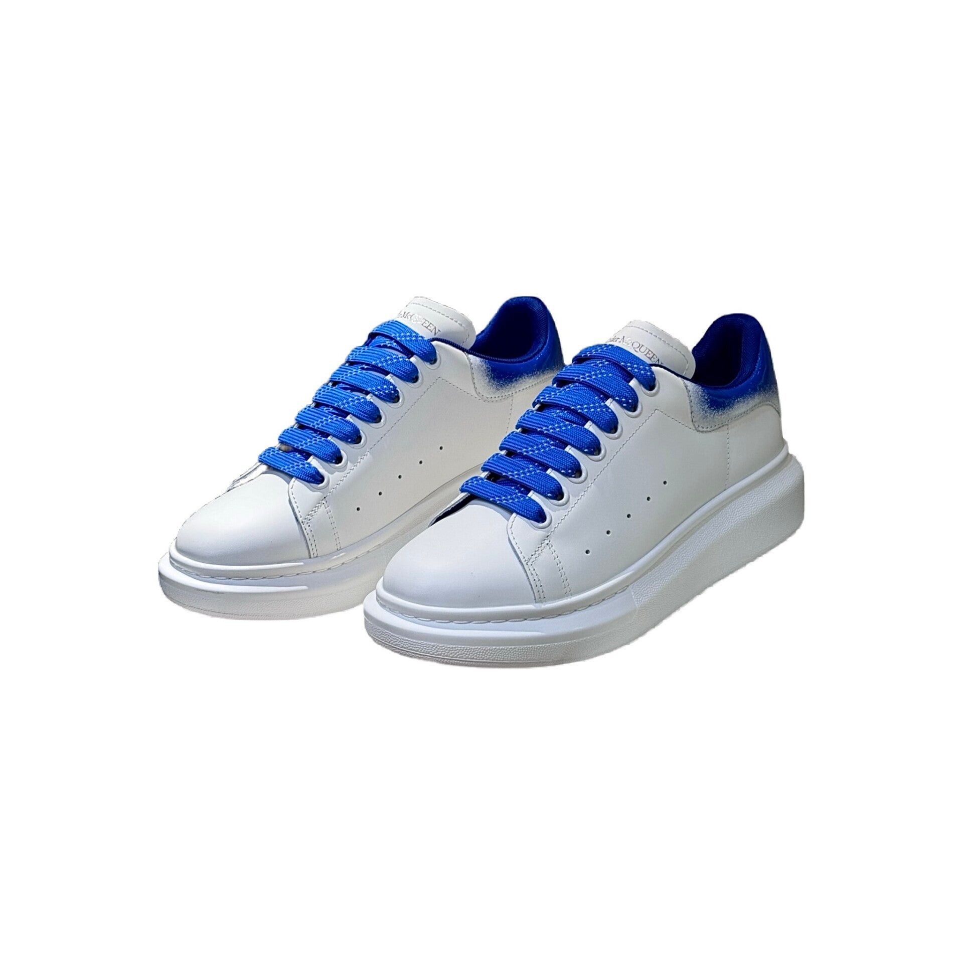 The ALEXANDER MCQUEEN Oversized Sneakers are an iconic couple's style featuring an exaggerated thick platform sole, designed to add height with an athletic, fashionable appeal. This specific variant showcases a clean white calfskin leather body, contrasted strikingly by the blue dip-dyed or sprayed coloring on the heel tab, which is further complemented by matching blue laces. The sneakers feature a padded collar and rounded toe design, built with a sheepskin lining and cowhide footbed inside. The 4.5 cm thick rubber outsole is characteristic of the collection and aligns with the current fashion trend. These "must-have small white shoes" are suitable for both men and women.