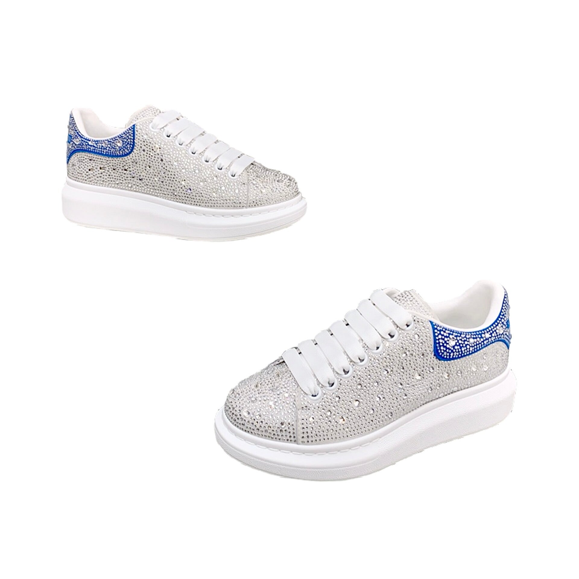 * Features: All-over crystal adornment, oversized platform rubber sole, contrast blue crystal branded heel counter