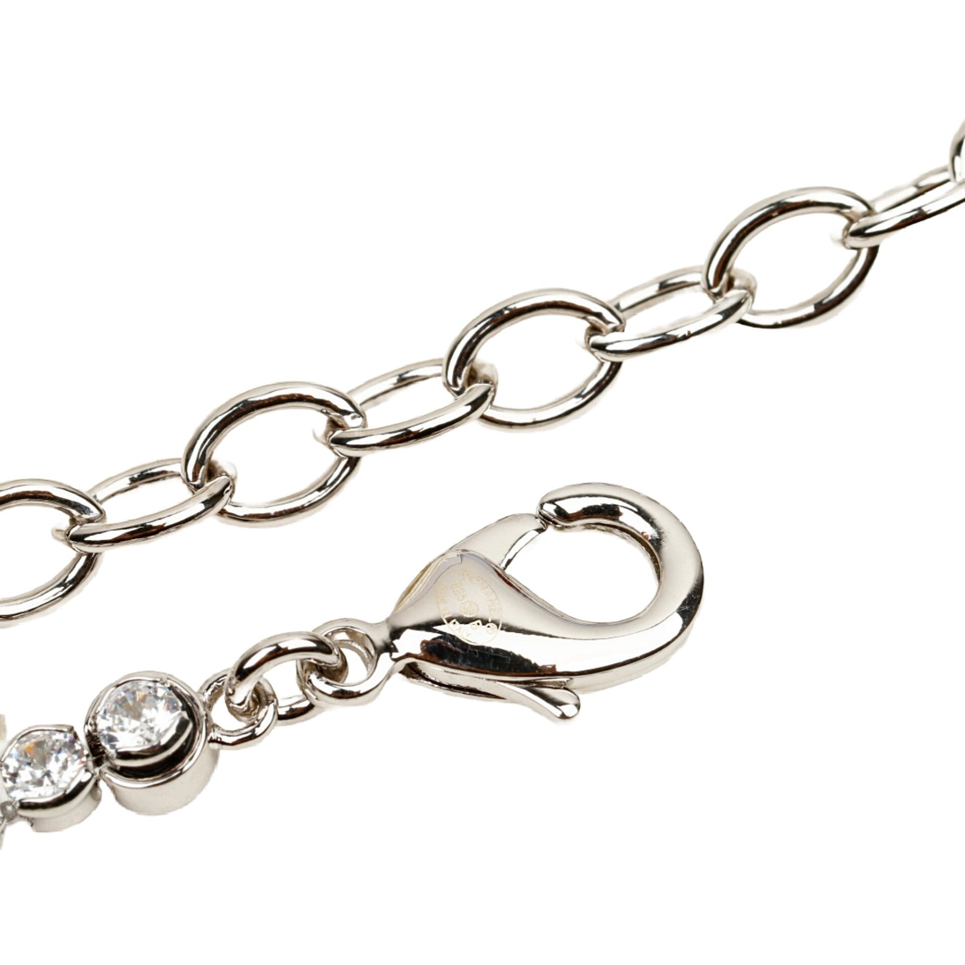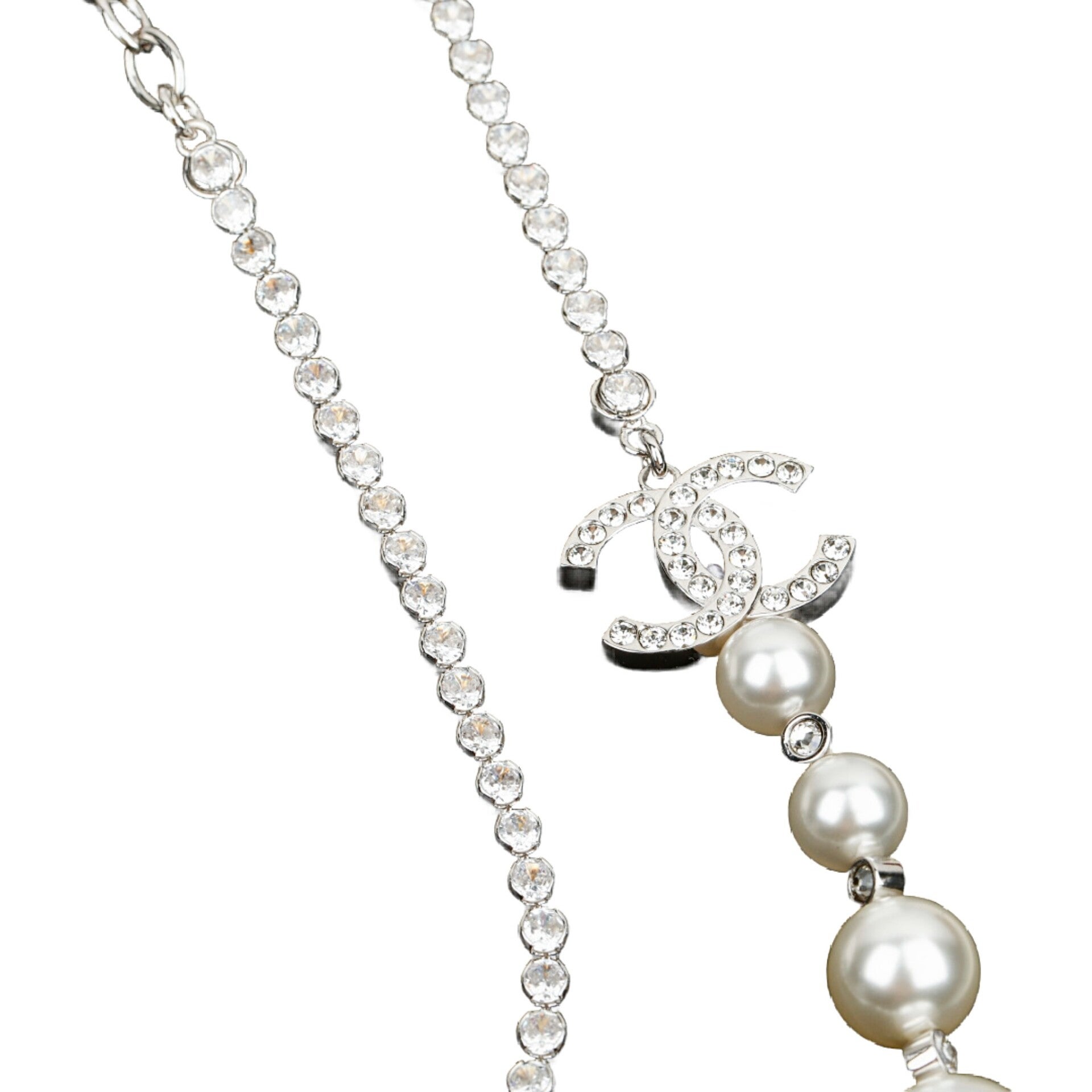The CHANEL Pearl And Crystal CC Choker Necklace elegantly merges classic femininity with modern glamour. This distinctive piece features a graduated arrangement of lustrous imitation pearls centered along the lower edge, contrasting beautifully with a strand of sparkling, pave-set crystals that form the upper neckline. The necklace is completed by the iconic interlocked CC logo, which is fully paved with crystals and sits as a striking accent near the closure or along the chain. Finished with an adjustable chain and lobster clasp, this choker is a timeless accessory that instantly adds sophistication and the unmistakable essence of CHANEL to any outfit.