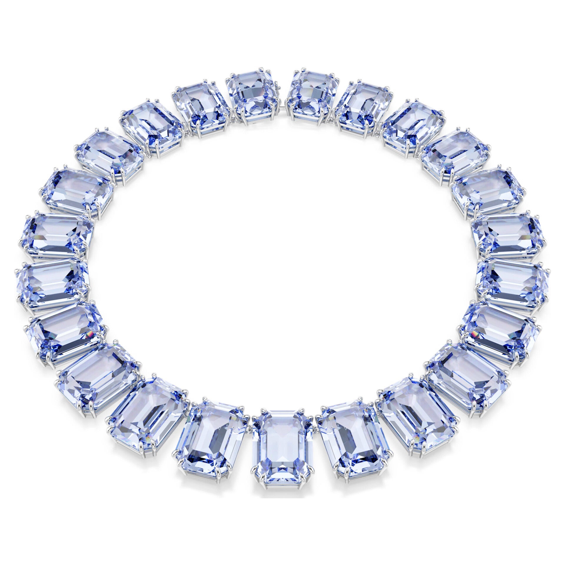Make a bold and vibrant statement with this striking Millenia necklace, designed to be the ultimate focal point of any ensemble. This captivating piece features a seamless row of oversized, octagon-cut crystals in a deep, alluring blue. Set in a sleek rhodium-plated metal frame, the crystals are meticulously arranged to maximize their brilliance and light-reflecting properties. The design is finished with a discreet hidden closure, providing a smooth and sophisticated aesthetic that wraps elegantly around the neck. Whether worn for a gala evening or to elevate a simple daytime look, this necklace embodies the bold creativity and precision of Swarovski.