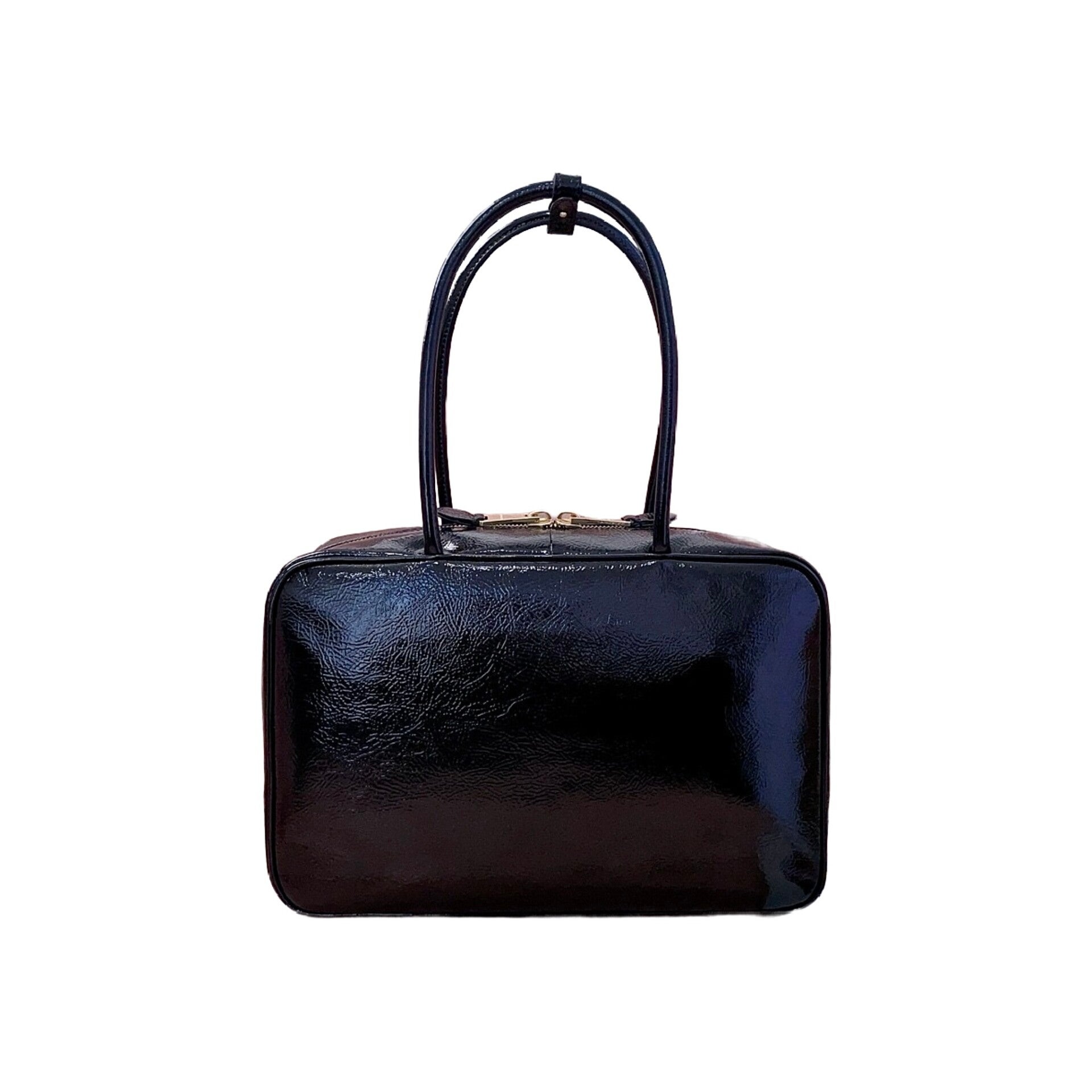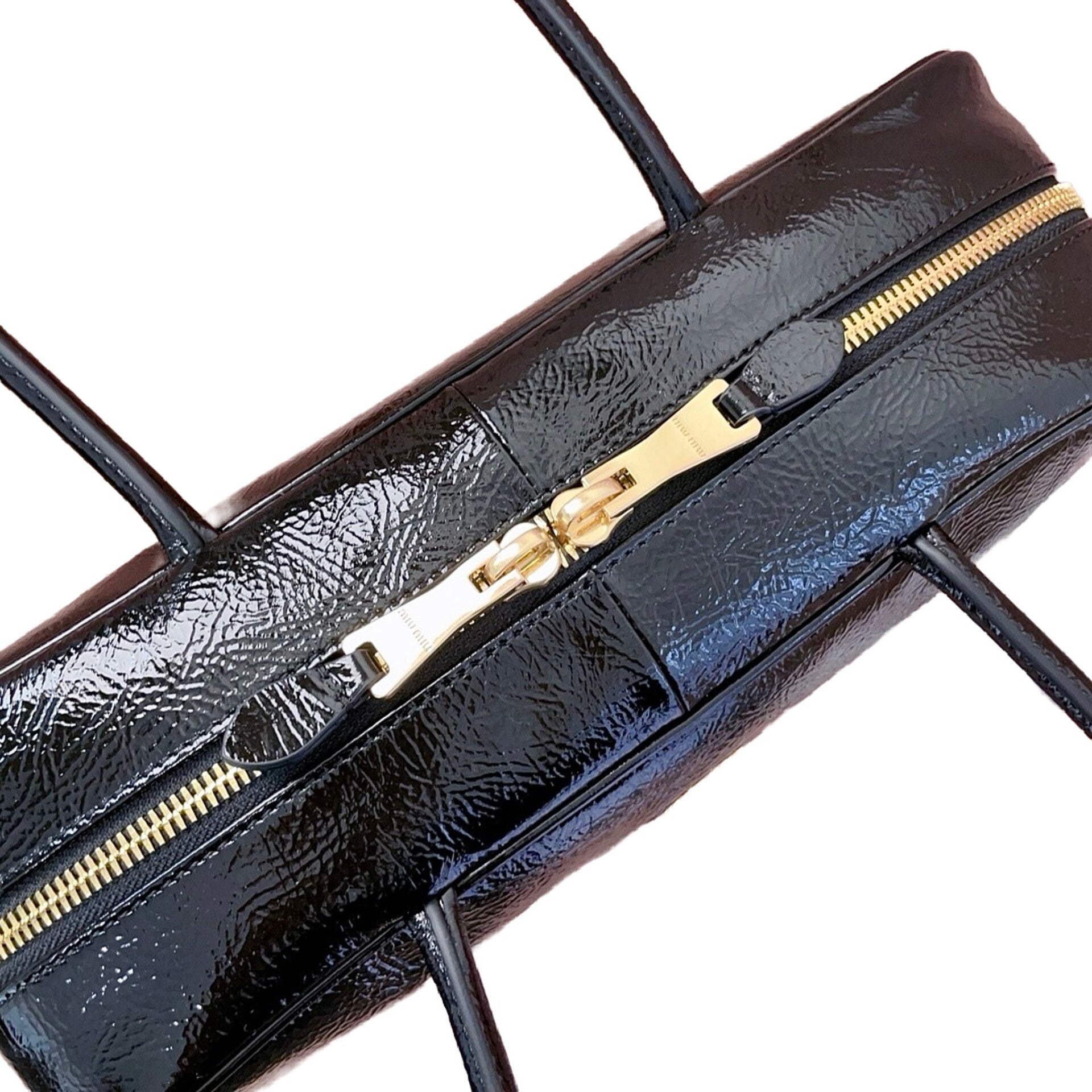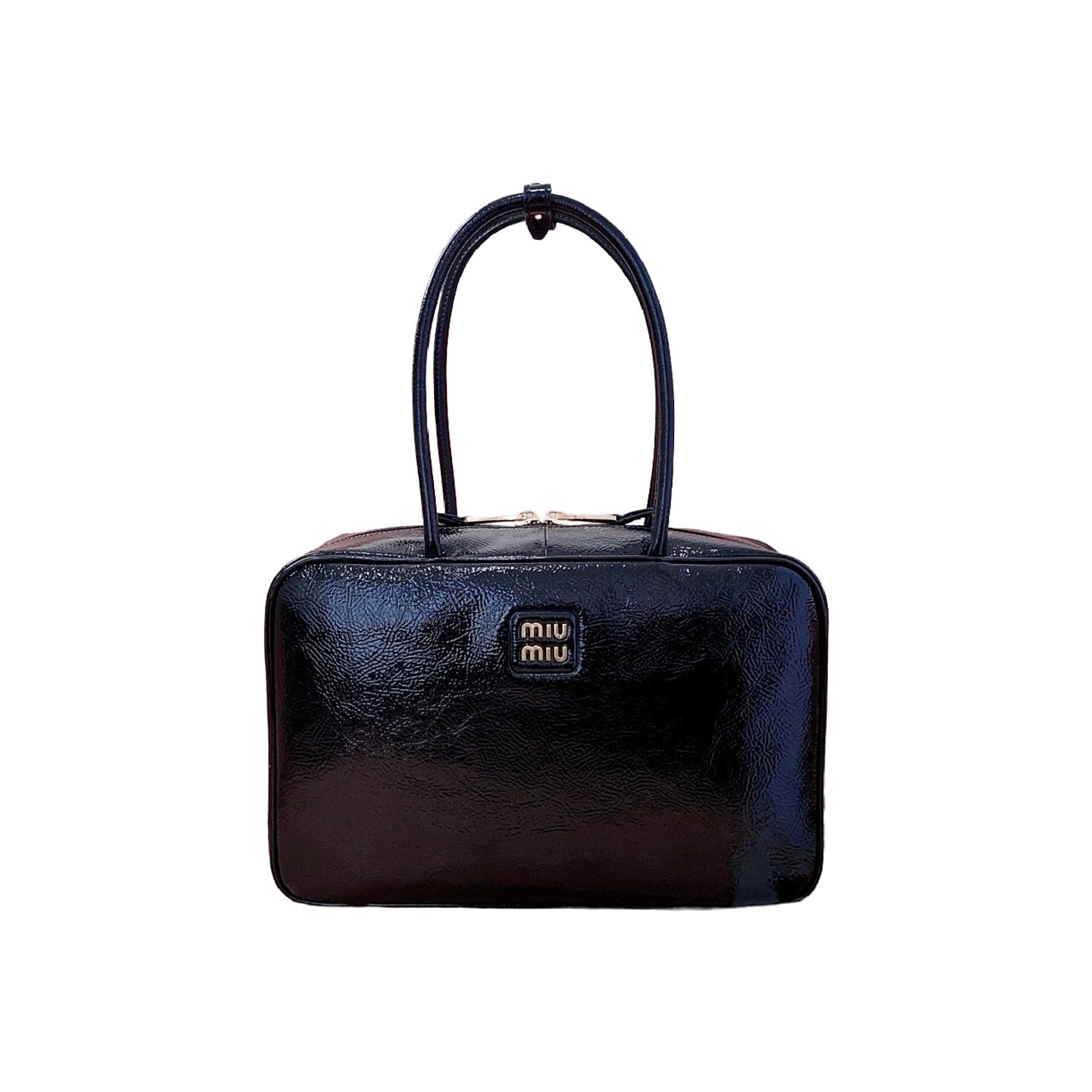 Embodying an eclectic and carefree attitude, this top-handle bag is a highlight of the new Miu Miu collection. It is meticulously crafted from a unique glossy aged-varnish leather (油蜡漆皮), featuring a distinctive cracked ice texture that adds a bold, rebellious edge to its sophisticated silhouette. This versatile design perfectly balances effortless "lazy chic" with functional modernity, making it a favorite among global fashion influencers and celebrities. Despite its oversized capacity, the bag remains remarkably lightweight and is finished with a durable new canvas lining. Adorned with the tonal embossed Miu Miu logo, it serves as a powerful statement of individuality and spontaneous style.