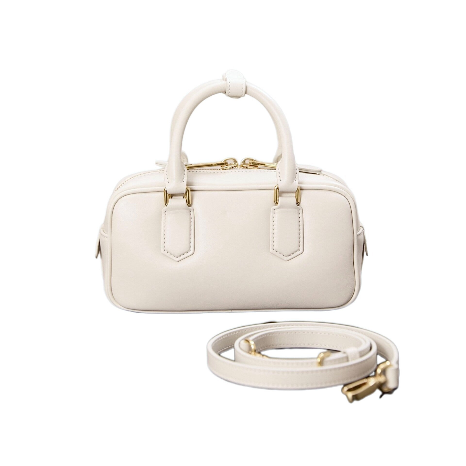 A cornerstone of Miu Miu's modern identity, the Arcadie bag reinterprets the classic silhouette with a sophisticated and cosmopolitan soul. This version is meticulously crafted from premium smooth calf leather and features subtle light padding, which gives the bag a compact yet voluminous and structured look. The front is elegantly accented with a varnished metal lettering logo that blends seamlessly with the bag's tonal aesthetic. Designed for the versatile lifestyle of the modern woman, it includes double leather handles for hand-carry and a detachable, adjustable leather shoulder strap for crossbody convenience. The minimalist Chalk White hue makes it an impeccable choice for effortless styling across seasons.