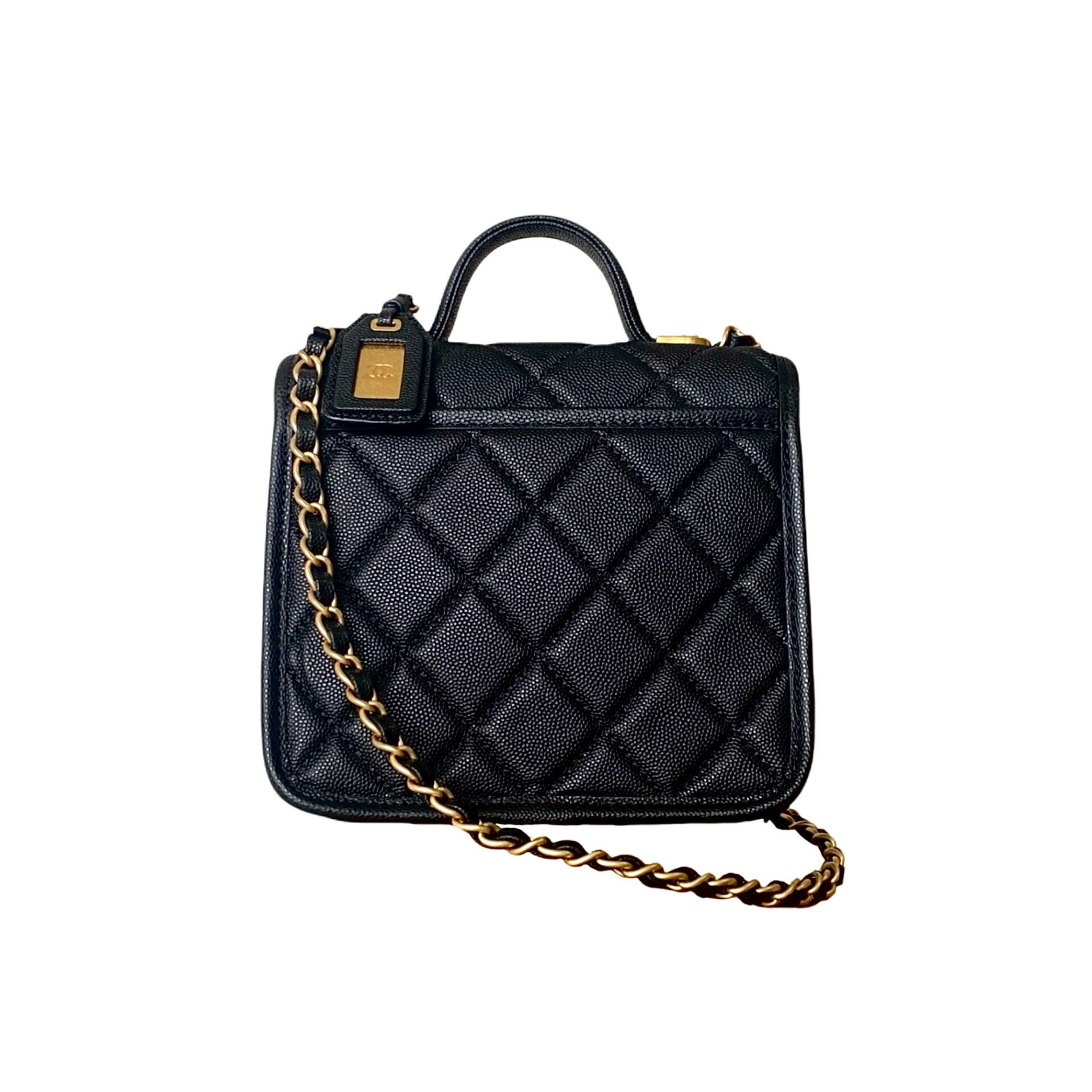 A sophisticated blend of structure and classic Maison codes, this Chanel Messenger Bag (often referred to as the "Tofu Bag" for its clean, rectangular silhouette) is a timeless addition to any collection. Crafted from premium fine caviar leather (grained calfskin), the material is celebrated for its exceptional durability and elegant, textured finish. The bag features the iconic diamond quilting and is adorned with a polished gold-tone CC turn-lock on the front flap. A unique highlight is the integrated leather-interlaced chain strap that coordinates with a sturdy top handle, offering multiple carrying options from hand-held to crossbody. The addition of a decorative gold-tone "CHANEL" hangtag adds a modern, branded touch to this quintessential piece.