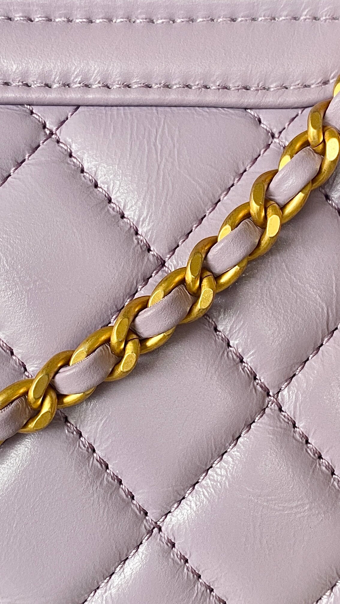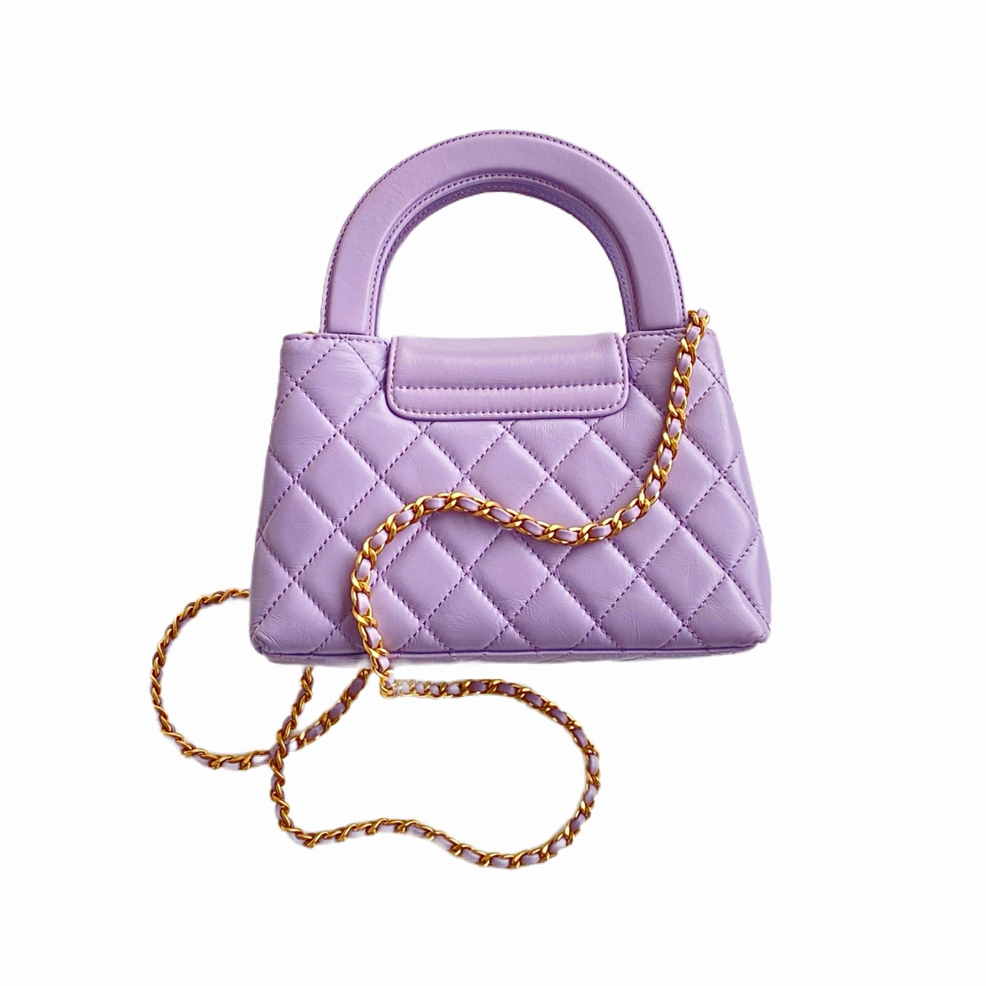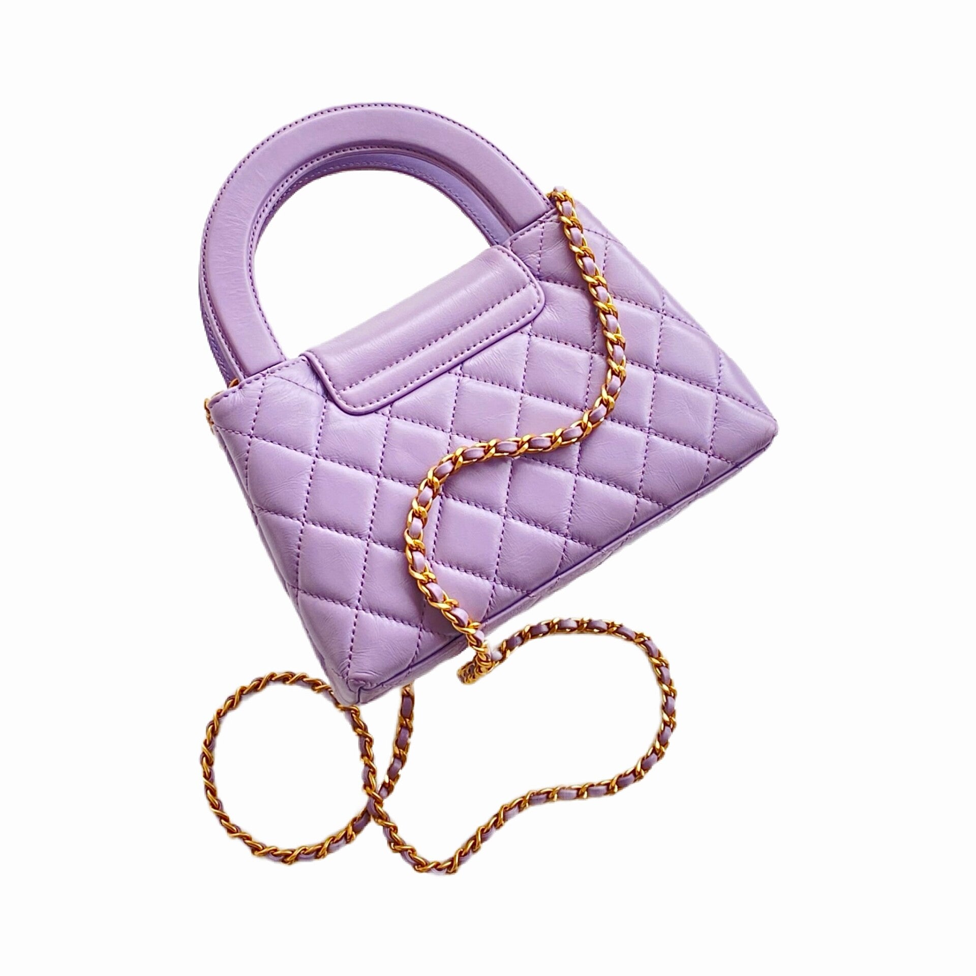 A standout piece from the Spring-Summer 2024 (24P) collection, this Mini Shopping Bag (popularly known as the 'Kelly' bag) reimagines a vintage silhouette with contemporary elegance. Crafted from premium aged calfskin, the leather features a subtle crinkled texture and a luminous finish that enhances the depth of the seasonal Provence Purple (Lilac) hue. The bag is characterized by its structured rigid top handle and the iconic interlocking CC turn-lock in polished gold-tone metal. Its versatile design includes a leather-interlaced chain strap, allowing it to be carried by hand for an evening look or worn as a sophisticated shoulder bag for daytime. This compact yet striking accessory perfectly embodies the bold and colorful spirit of the 24P collection.