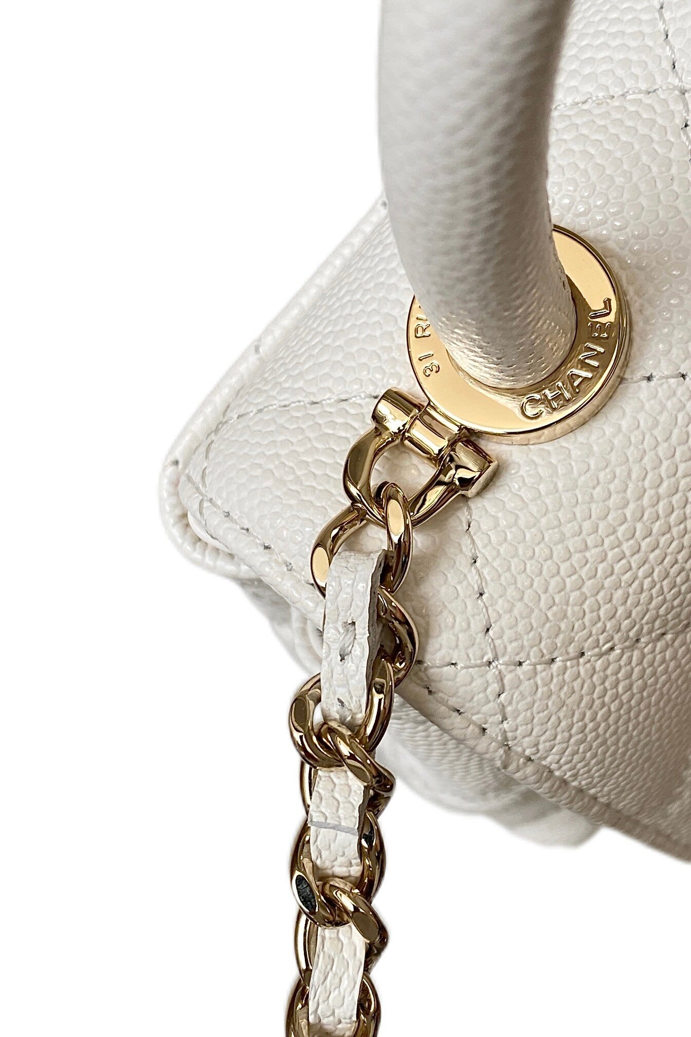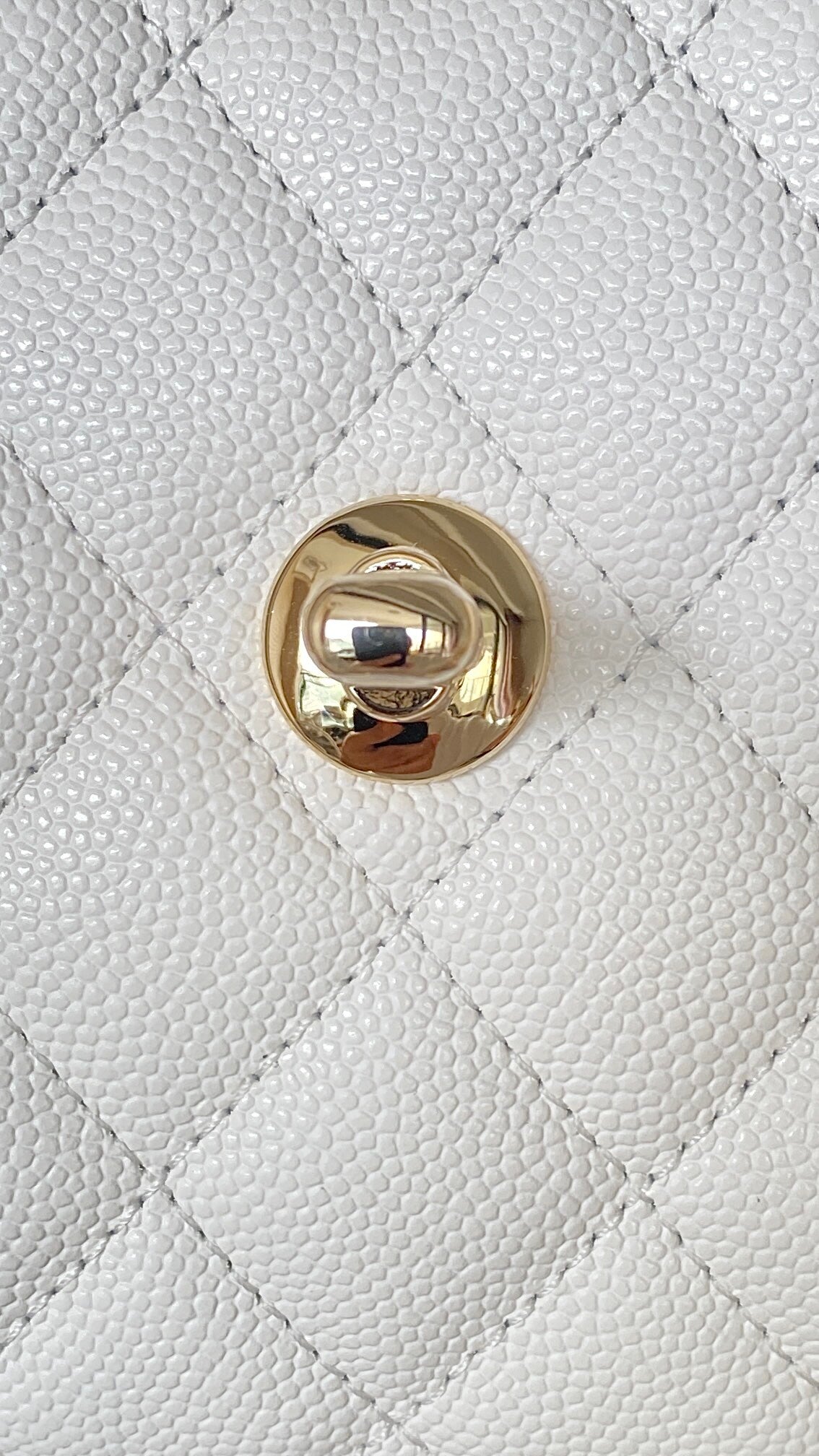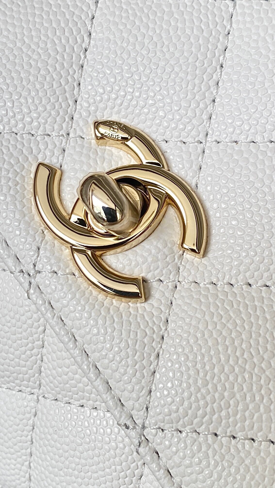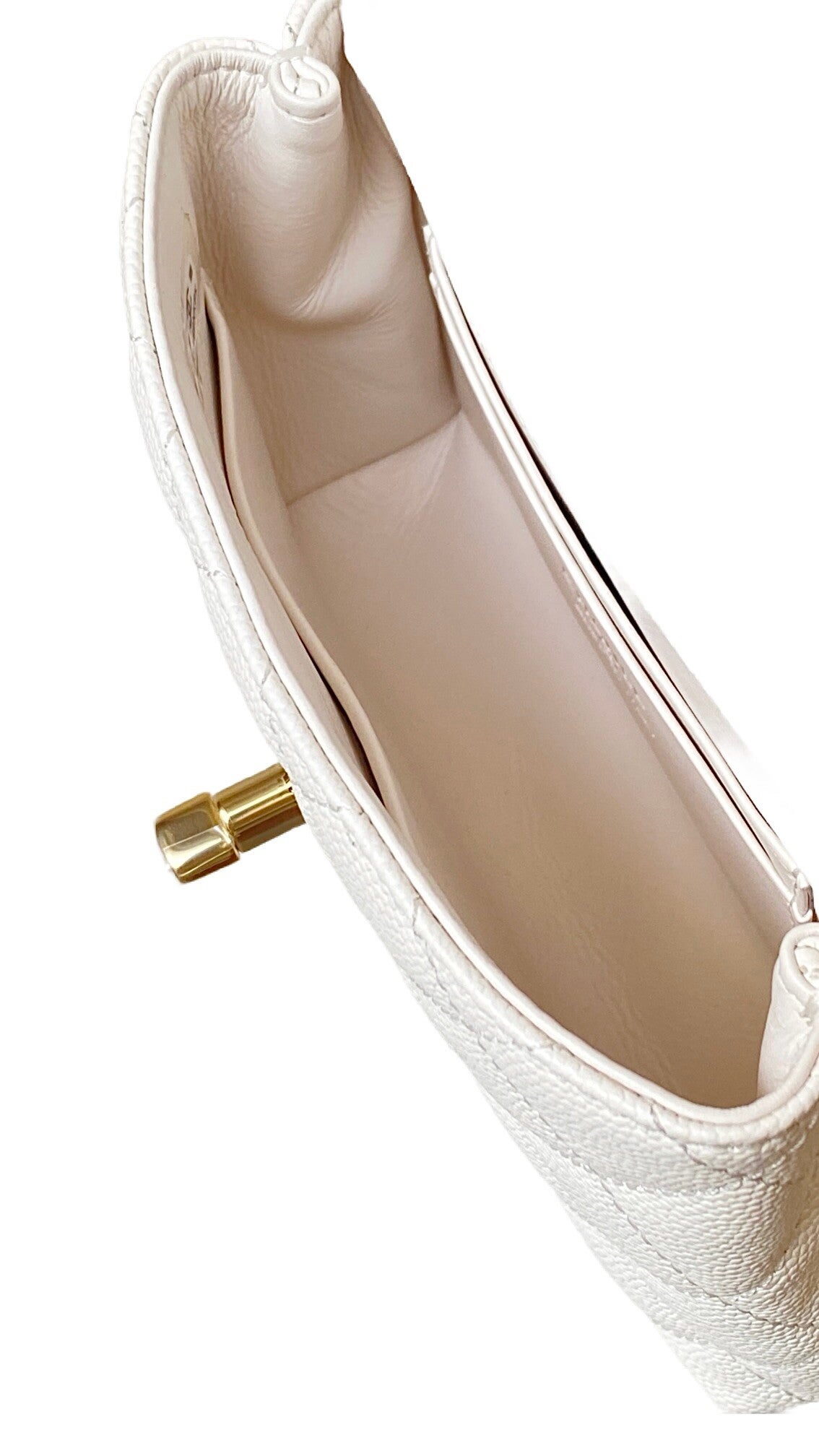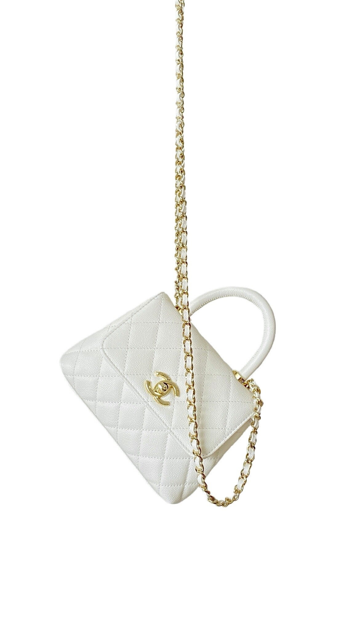 A highlight of the Fall-Winter 2024 (24K) collection, the Coco Handle Nano is a masterful blend of heritage elegance and modern proportions. This exquisite piece is crafted from premium Haas fine caviar calfskin, a material renowned for its delicate grain, structured resilience, and luxurious soft-touch finish. Presented in a pristine pure white, the bag features classic diamond quilting and is accented with signature champagne gold-tone hardware, including the iconic interlocking CC turn-lock. The design is characterized by its elegant rigid top handle and a versatile leather-interlaced chain strap, allowing it to be carried by hand or worn as a sophisticated crossbody bag. This nano-sized iteration offers a compact yet striking silhouette, making it the ultimate accessory for high-fashion minimalists.