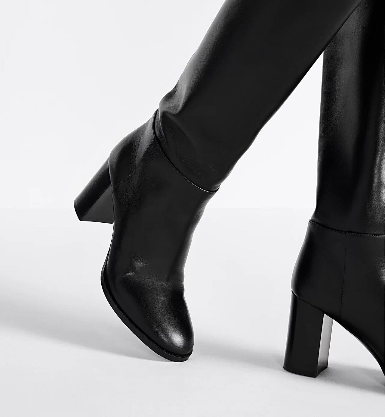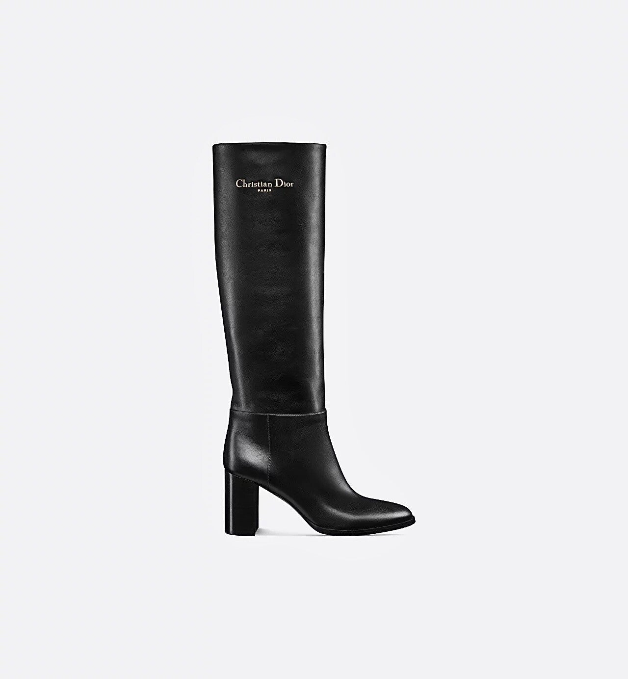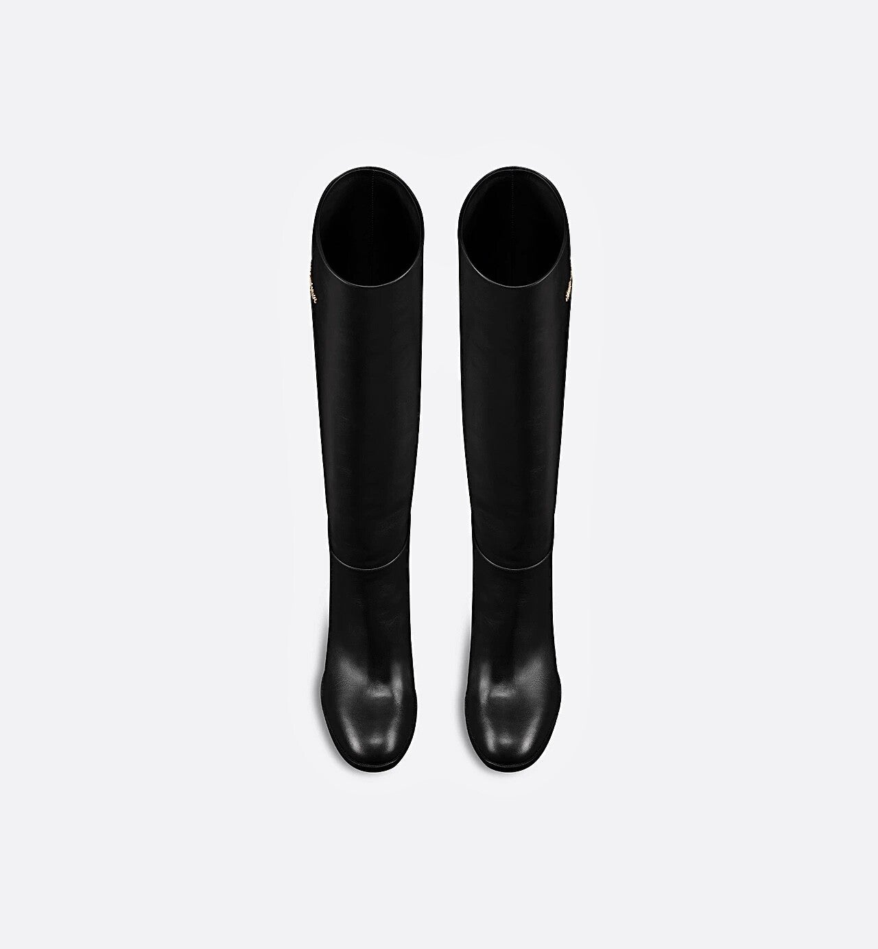 A standout piece from the Winter 2024 Ready-to-Wear collection, the D-Town heeled boot reinterprets the classic equestrian silhouette with a modern, high-fashion edge. Meticulously crafted in Italy from premium supple black calfskin, this boot features a sophisticated straight-leg design that balances structure with comfort. The lateral side is elegantly adorned with a gold-finish metal "Christian Dior Paris" signature, adding a touch of archival luxury to the minimalist aesthetic. Designed for both elegance and stature, the boot is set on an 8 cm (3.15 inch) block heel, providing a refined lift. The design is completed with a thin, textured rubber sole featuring a star symbol, a signature emblem of Christian Dior's luck.