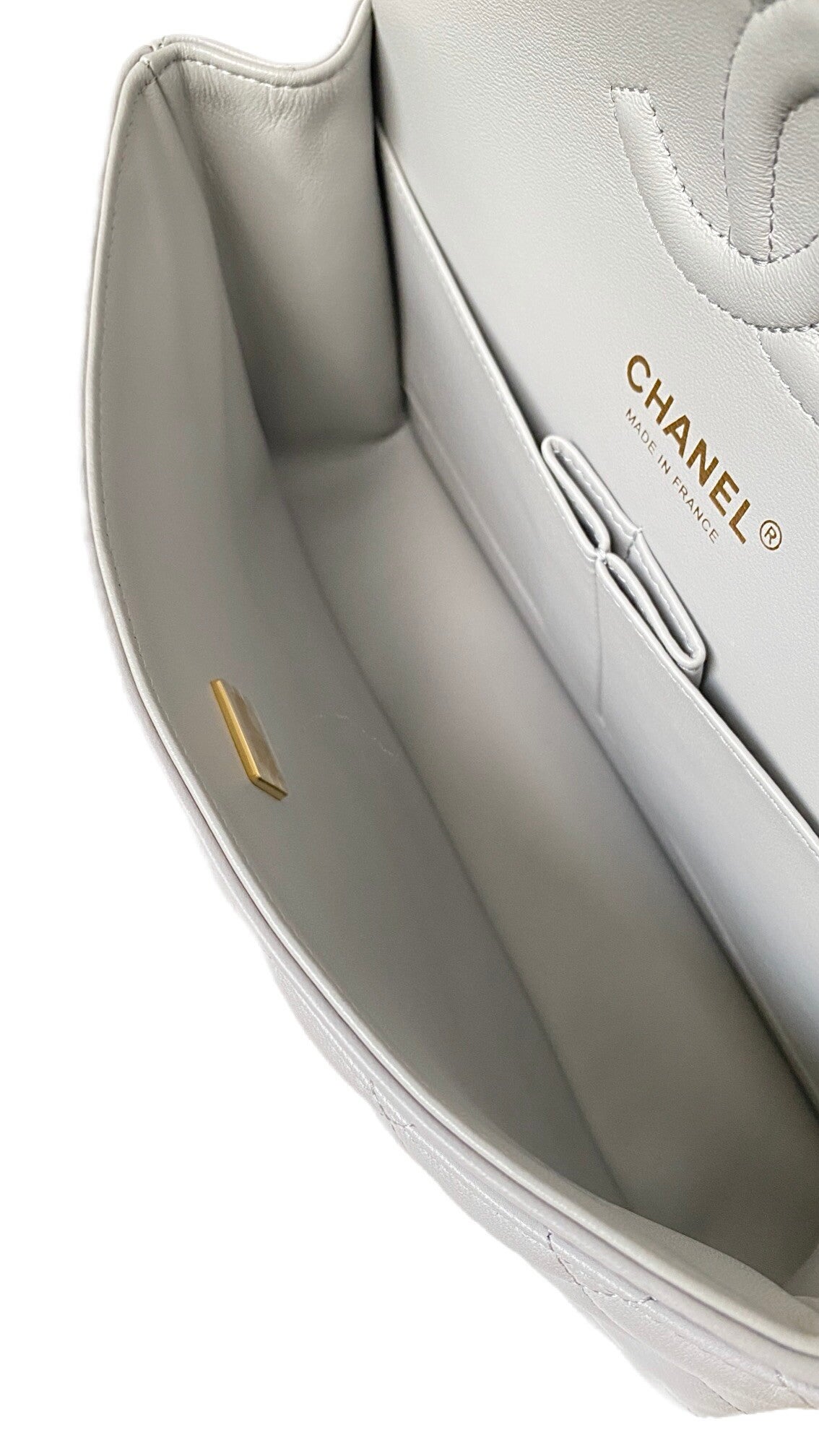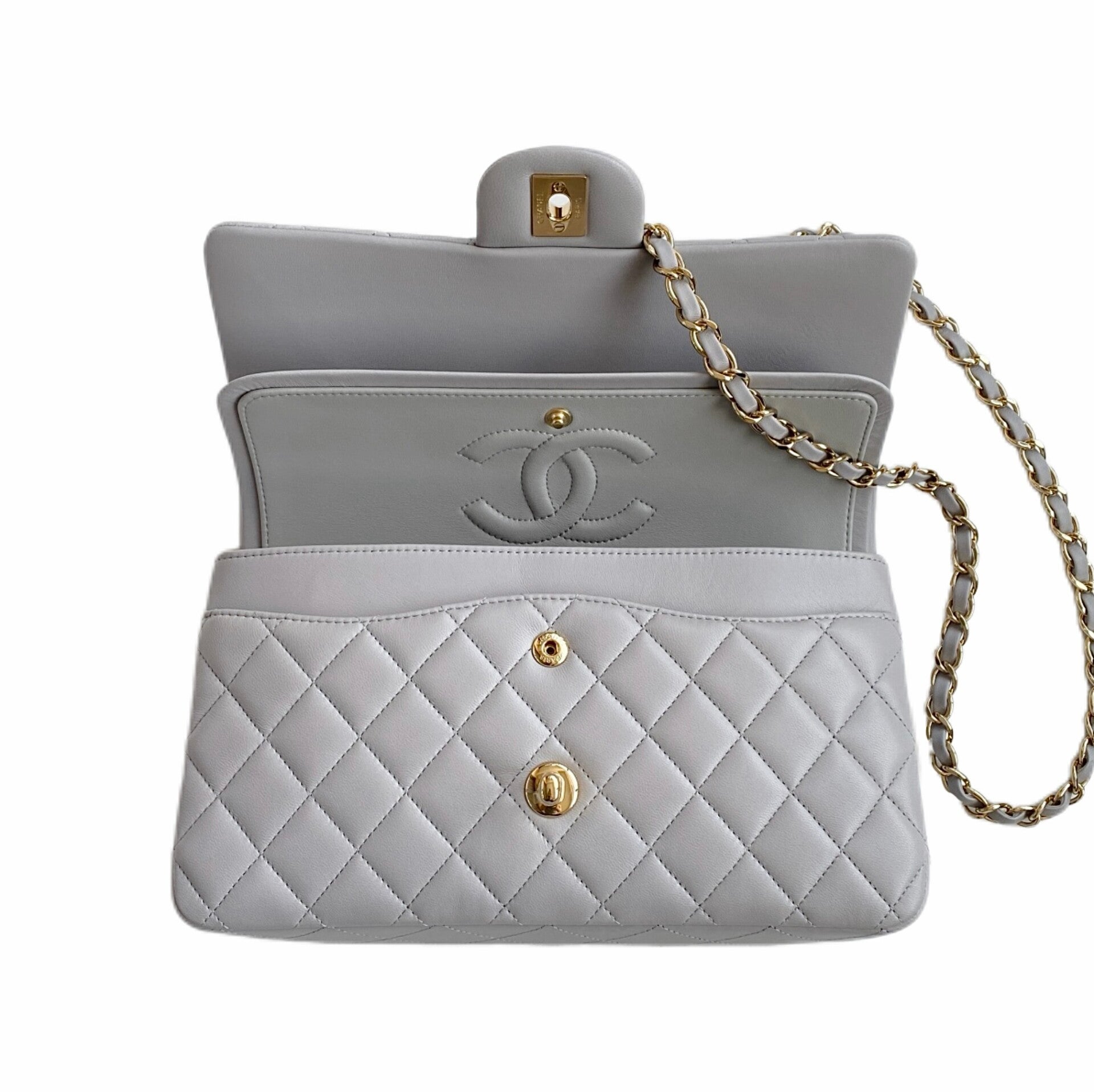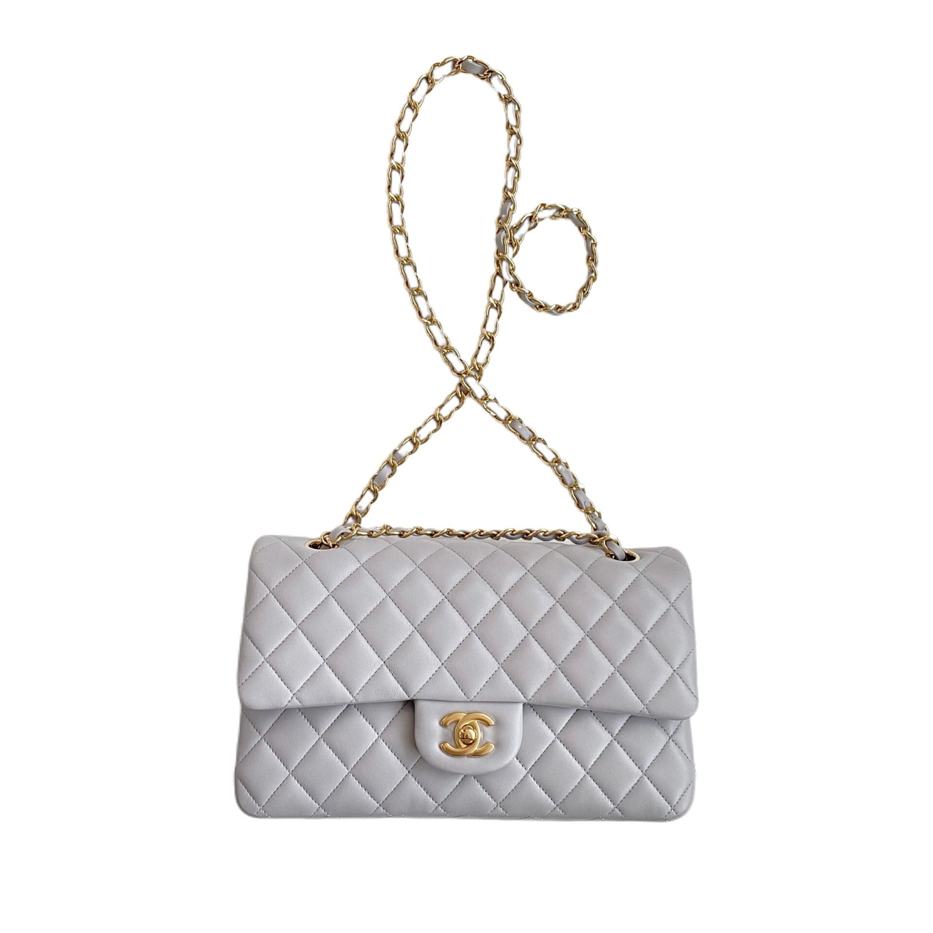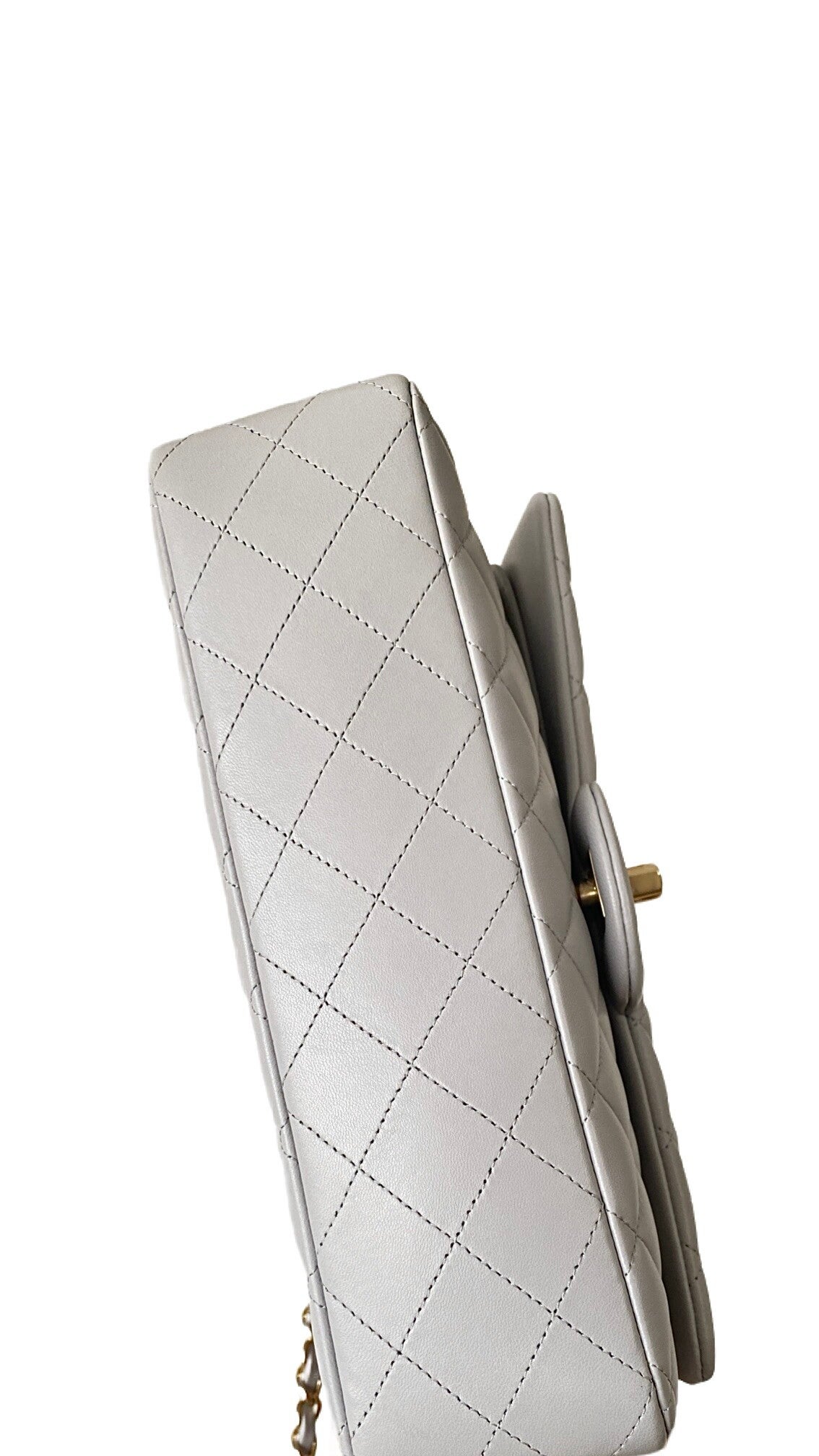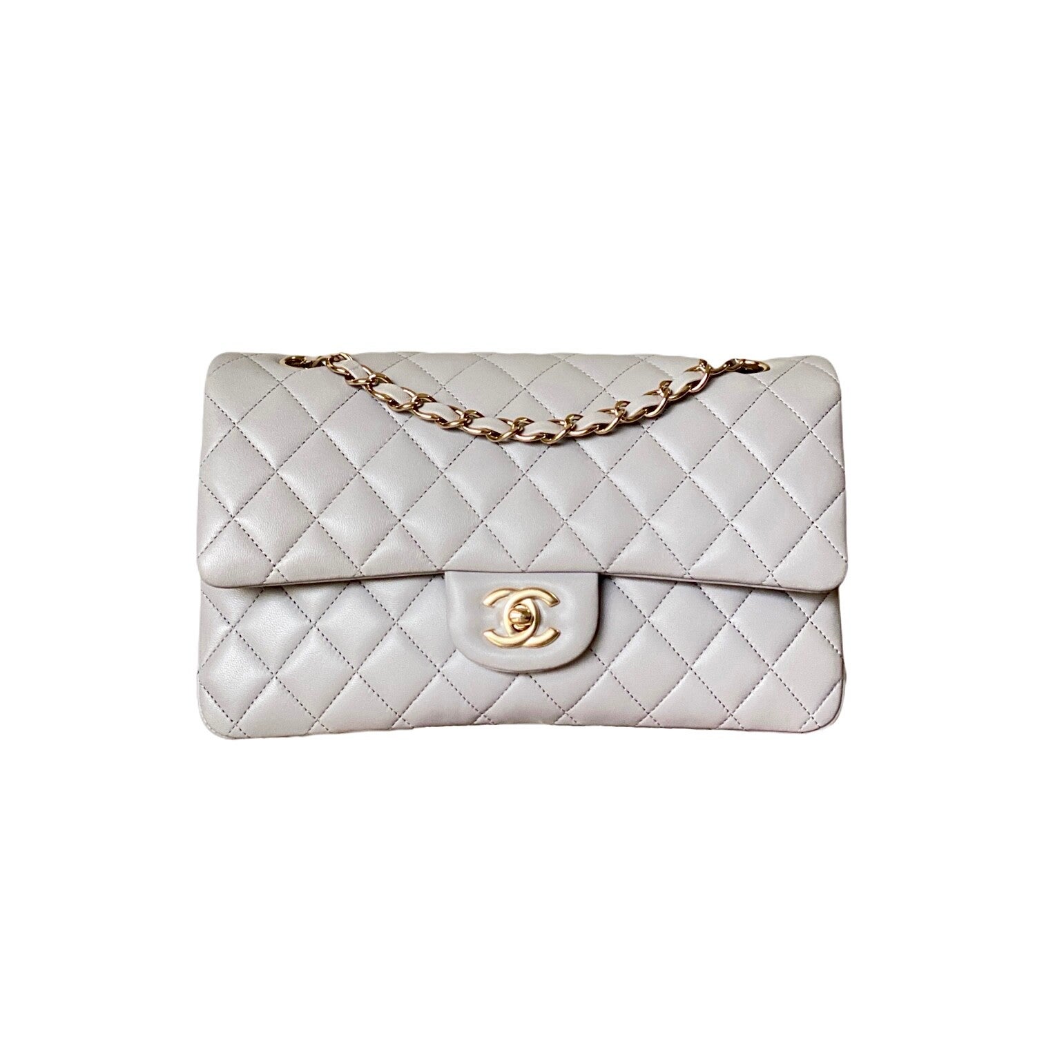 A timeless pillar of the House, the Classic Medium Flap Bag—often referred to as the M/L—is the quintessential embodiment of CHANEL’s enduring allure. This iteration is meticulously crafted from premium Bodin-Joyeux lambskin, sourced from one of France’s most prestigious tanneries owned by the House, celebrated for its buttery-soft texture and natural luminosity. The sophisticated grey leather is beautifully offset by polished gold-tone hardware, including the iconic interlocking CC turn-lock and the signature leather-interlaced chain strap. Designed with the historic double flap, the interior features a series of functional compartments and the traditional "Monet" smile pocket at the rear. Balancing heritage craftsmanship with modern versatility, it remains a cornerstone of any discerning luxury collection.