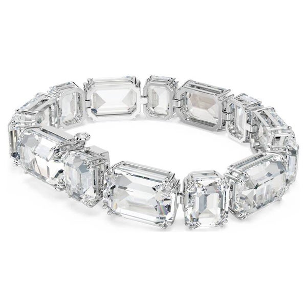 Embrace the power of simplicity with this stunning Millenia bracelet. This rhodium-plated metal design is adorned with octagonal-cut, colorless crystals, alternating horizontal and vertical positions. With its bold sparkle, this piece will elevate any outfit, day or night. Pair it with a matching necklace to amplify its brilliance.